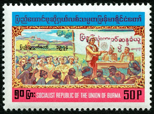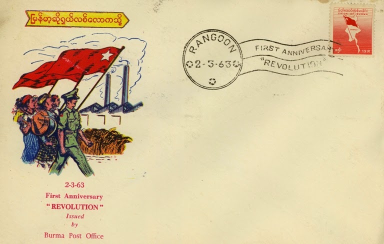 “ညီလာခံတုိ႔၊ ဆႏၵခံယူပဲြတုိ႔၊ အေျခခံဥပေဒတုိ႔ဆုိတာေတြကုိ- တုိ႔တုိင္းျပည္မွာ ေခတ္အဆက္ဆက္၊ အစုိးရအဆက္ဆက္လုပ္ခဲ့ၾကသကြ။ သတင္းစာ၊ စာေစာင္၊ ေရဒီယုိစတဲ့ မီဒီယာေတြကတဆင့္ မ်က္ေစ့ေနာက္ေအာင္၊ နားမဆန္႔ေအာင္ ဖတ္ခဲ့ရ၊ ၾကားခဲ့ရသကြ၊ အခုေနာက္ ေၾကာင္းကုိ ျပန္ၾကည့္လုိက္ေတာ့ အဲဒါေတြဟာ- တခုမွ အစစ္မွန္ေတြမဟုတ္ဘဲ လိမ္ဆင္ေတြခ်ည္းျဖစ္ေနတယ္။ PROPAGANDA ေခၚတဲ့ ဝါဒျဖန္႔လုပ္ရပ္ေတြဘဲ ျဖစ္ေနတယ္ကြ။ ကဲ-ပါ၊ လာရင္းကိစၥျဖစ္တဲ့ တံဆိပ္ေခါင္းနဲ႔ ပတ္သက္တာကုိ ကြက္ပီးေျပာျပရရင္ေတာ့…. ၁၉၆၂မွာ ဗုိလ္ခ်ဳပ္ေနဝင္း အာဏာသိမ္းပီး တက္လာတာကုိ မွတ္မိတယ္မဟုတ္လား။ ျပည္ေထာင္စုႀကီးမၿပိဳကြဲေအာင္ အာဏာသိမ္းရတာပါ၊ တုိင္းျပည္ႀကီး ေခ်ာက္ထဲမက်ရေလေအာင္ အာဏာသိမ္းရတာပါ-လုိ႔အေၾကာင္းျပပီး- စစ္အာဏာရွင္စနစ္ကုိ စခဲ့တာေလ။ အဲဒီ “ေတာ္လွန္ ေရးေကာင္စီ” (REVOLUTIONARY COUNCIL) ဆုိတဲ့ စစ္ဗုိလ္ေတြပါတဲ့ စစ္အုပ္စုက တုိ႔တုိင္းျပည္ကုိရပီး ၆ လေတာင္မၾကာေသးဘူး “ျမန္မာ့ဆုိရွယ္လစ္လမ္းစဥ္” နဲ႔ ခ်ီတက္မယ္လို႔ မဟုတ္တရုပ္ဝါဒျဖန္႔ေတာ့တာဘဲ။ သူတုိ႔အုပ္စုိးလုိ႔ တစ္ႏွစ္ျပည့္တဲ့ ၁၉၆၃ မတ္လ (၂)ရက္ေန႔မွာ- ႏွစ္ပတ္လည္အထိမ္းအမွတ္ တံဆိပ္ေခါင္းေတာင္ ထုတ္လုိက္ေသး”