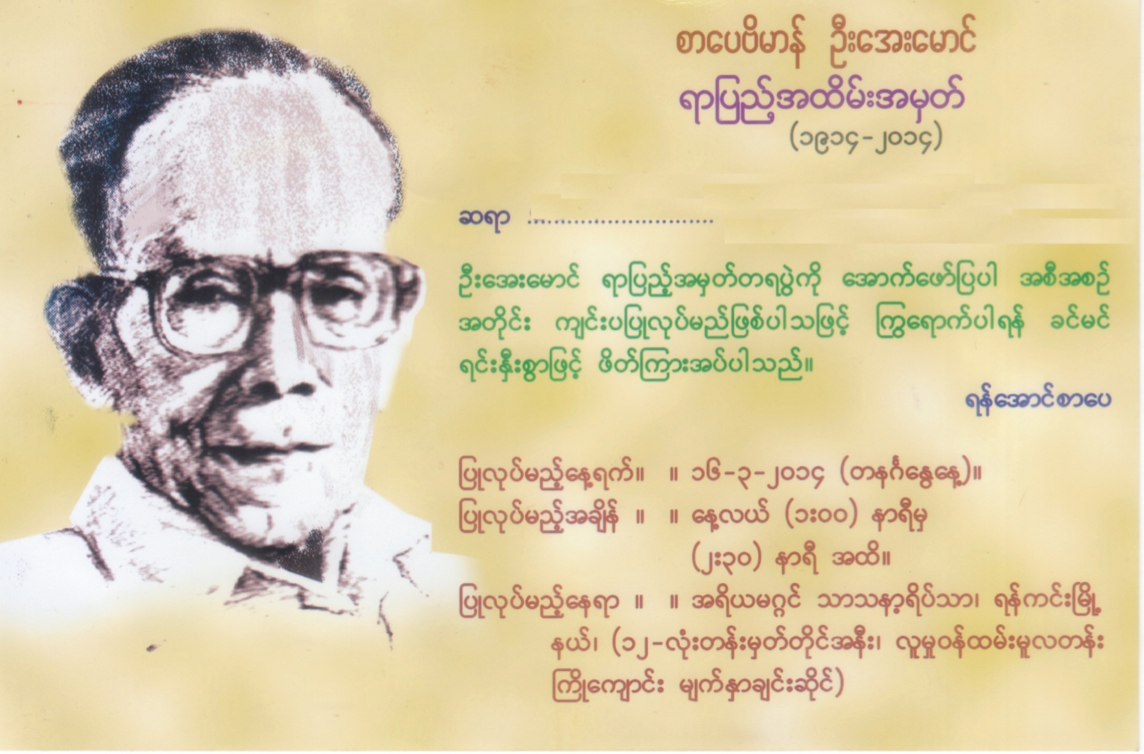 စာေပဗိမာန္ ဦးေအးေမာင္ (၁၉၁၄ – ၂၀၁၄) ရာျပည့္အထိမ္းအမွတ္ကုုိ အရိယမဂၢင္ သာသနာ့ရိပ္သာ၊ ရန္ကင္းျမိဳ႕နယ္တြင္ မတ္ ၁၆၊ တနဂၤေႏြေန႔၊ ေန႕လည္ ၁နာရီမွ ၂နာရီခဲြအထိ က်င္းပျပဳလုုပ္ခဲ့သည္။
