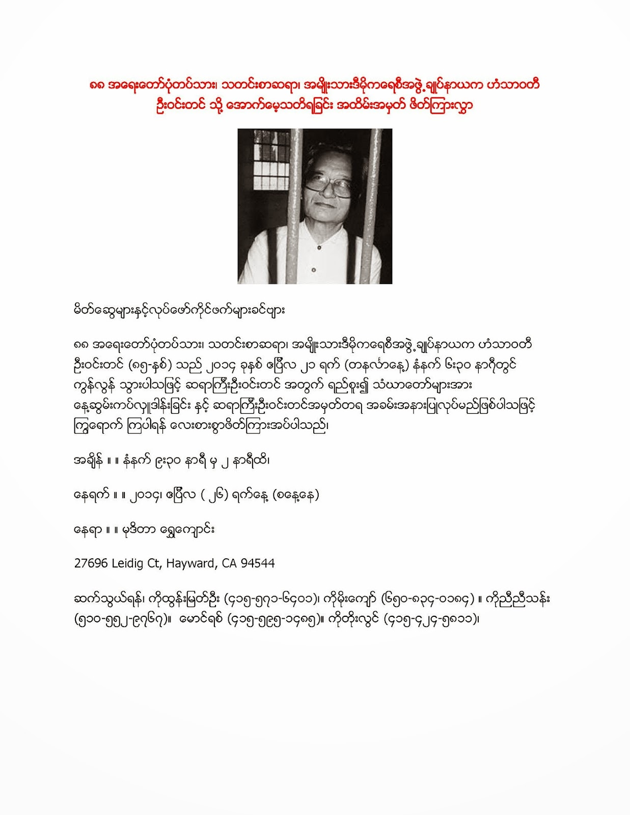 ဆန္ဖရန္ေဘးဧရိယာ ျမန္မာမိသားစုမ်ား ဦး၀င္းတင္ကြယ္လြန္ျခင္း ဂါရ၀ျပဳ အခမ္းအနား က်င္းပမည္