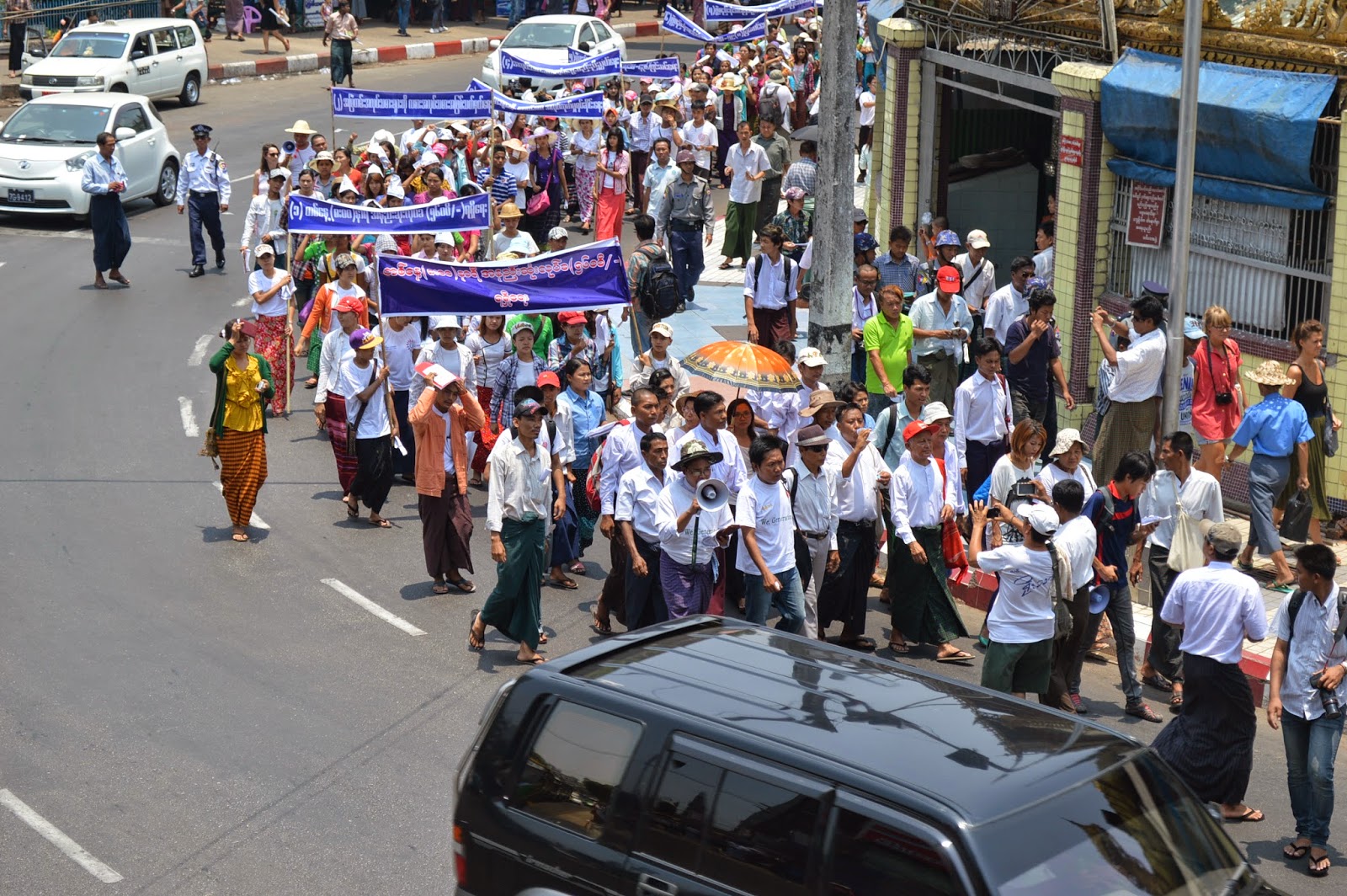 ပူျပင္းလွေသာေနေရာင္ေအာက္တြင္ ဆႏၵျပလူအုပ္ႀကီး သည္ အပူဒဏ္ကိုအံတုကာ ေၾကြးေၾကာ္သံမ်ားသံျပိဳင္ ဟစ္ေၾကြး၍ မဟာဗႏၵဳလပန္းျခံလမ္းမွစတင္ကာ မဟာဗႏၶဳလ လမ္းမႀကီးေပၚ တေလွ်ာက္ ၊ထိုမွတဆင္႕ ပန္းဆိုးတန္းလမ္းသို႔ ေကြ႕ကာ ကုန္သည္လမ္း၊ဆူးေလဘုရားလမ္း၊ထိုမွတဆင္႕ ဆူးေလဘုရားအား တပတ္ပတ္ကာ ဆႏၵထုတ္ေဖာ္ပြဲကို ျပဳလုပ္ခဲ႕ၾကသည္ ။
