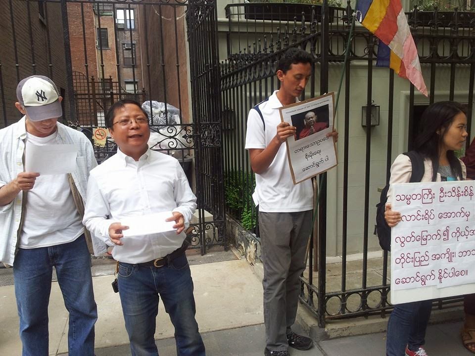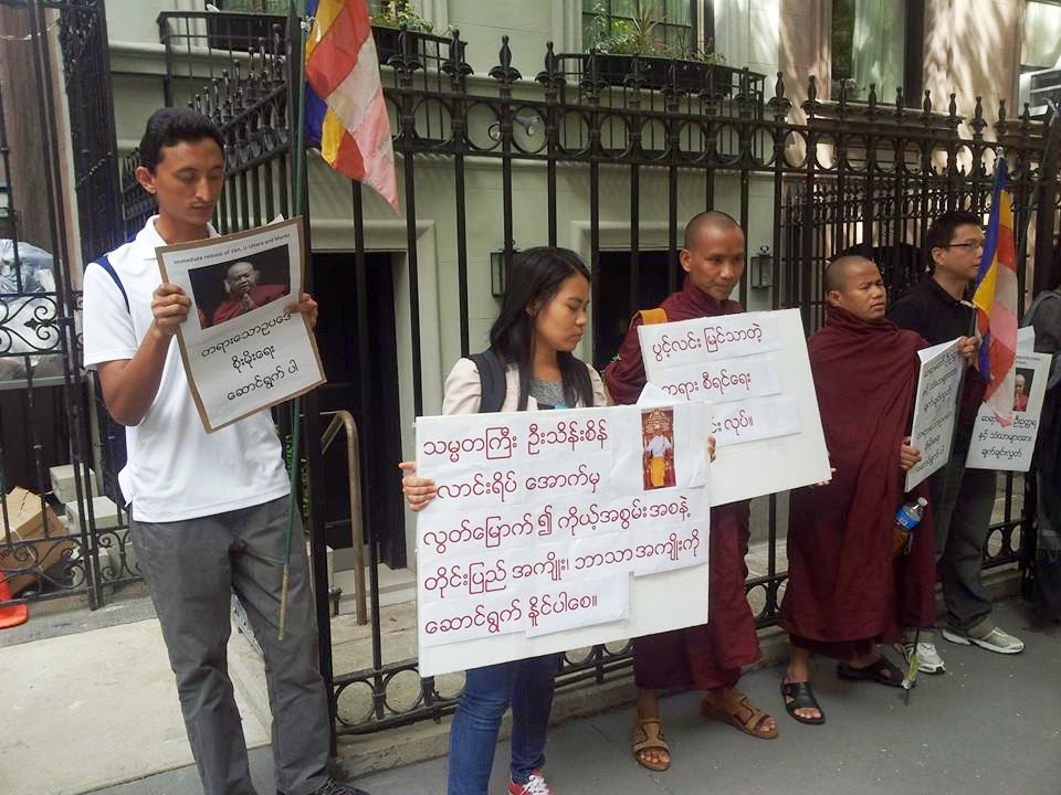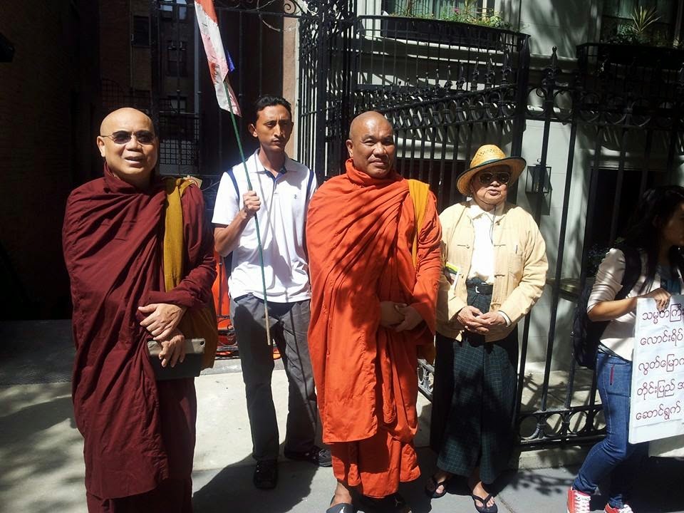 ျမန္မာ ရဟန္းေတာ္မ်ားႏွင့္ ပရိသတ္တို႔ နယူးေယာက္ျမိဳ့ ျမန္မာသံရုံးေရွ႔ သႏၱသုခအၾကမ္းဖက္မႈ ကန္႔ကြက္ဆႏၵျပ