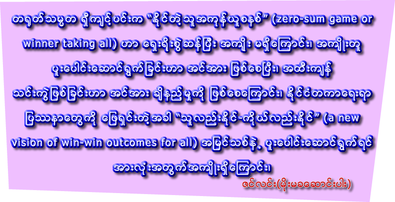 တ႐ုတ္သမၼတ ရွီက်င့္ပင္းက “ႏိုင္တဲ့သူအကုန္ယူစနစ္” (zero-sum game or winner taking all) ဟာ ေရွးရိုးစြဲဆန္ျပီး အက်ိုး မရွိေၾကာင္း၊ အက်ိဳးတူ ပူးေပါင္းေဆာင္ရြက္ျခင္းဟာ အင္အား ျဖစ္ေစၿပီး၊ အထီးက်န္ သင္းကြဲျဖစ္ျခင္းဟာ အင္အား ခ်ိနည့္မႈကို ျဖစ္ေစေၾကာင္း၊ ႏိုင္ငံတကာေရးရာ ျပႆနာေတြကို ေျဖရွင္းတဲ့အခါ “သူလည္းႏိုင္-ကိုယ္လည္းႏိုင္” (a new vision of win-win outcomes for all) အျမင္သစ္နဲ႕ ပူးေပါင္းေဆာင္ရြက္ရင္ အားလုံးအတြက္အက်ိဳးရွိေၾကာင္း၊ အဲဒီ “သူလည္းႏိုင္-ကိုယ္လည္းႏိုင္” အေျခခံမူ၀ါဒကို ရည္မွန္ခ်က္အျဖစ္ ထားရွိေဆာင္ရြက္သင့္ေၾကာင္း..စသျဖင့္ ေျပာၾကားသြားတာကို တရုတ္ျပည္သူ႕ေန႕စဥ္ (People’s Daily) မွာ ေဖၚျပထားပါတယ္။