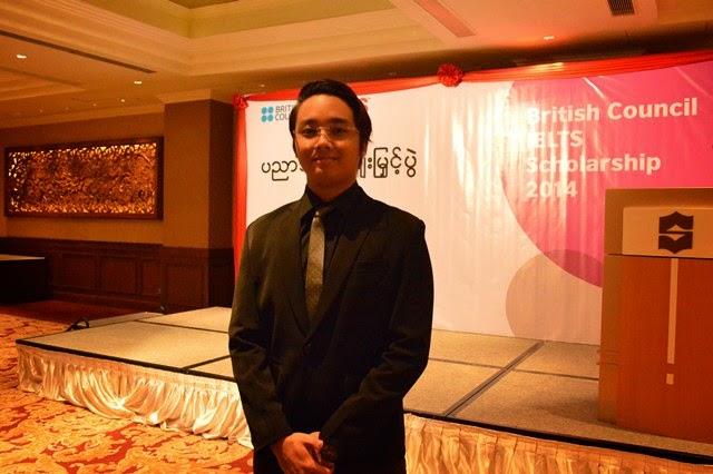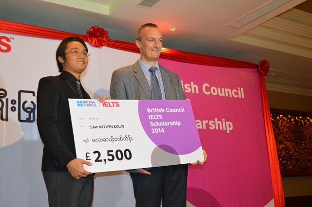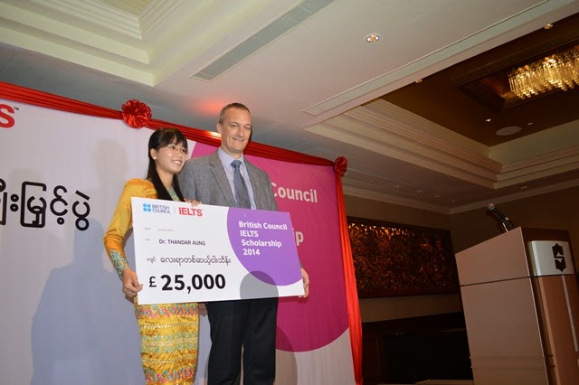 ၿဗိတိသွ်ေကာင္စီမွ ေပးအပ္ေသာ IELTS ပညာသင္ဆုကို ၂၀၁၄ ခုႏွစ္တြင္ ရရိွသြားေသာ ေဒါက္တာသႏၱာေအာင္ ႏွင္႕ ေစာမယ္လ္ဗင္ကိုကိုေလး တို႕ ႏွစ္ဦးအား ပညာသင္ဆု ေပးအပ္ပြဲကို ၂၀၁၄ခုႏွစ္ ဇူလိုင္လ ၂၃ ရက္ (ဗုဒၶဟူး)ေန႕ ေန႕လည္ ၃ နာရီခြဲအခ်ိန္၌ ရန္ကုန္ျမိဳ႕ဆူးေလဘုရားလမ္းေပၚရိွ ဆူးေလရွန္ဂရီလာဟိုတယ္တြင္ က်င္းပျပဳလုပ္ခဲ႕သည္။