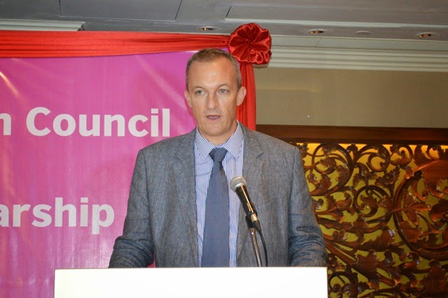 ေရွးဦးစြာ ၿဗိတိသွ်ေကာင္စီ၏ ျမန္မာနိုင္ငံ ညႊန္ၾကားေရးမွဴး Mr.Kevin Mackenzine မွ ႏႈတ္ခြန္းဆက္စကားေျပာၾကားရာတြင္ ႏုိင္ငံတကာ ပညာေရးသည္ လူငယ္လူရြယ္မ်ား ငယ္ရြယ္စဥ္အေတြ႕အႀကံဳရရိွေစရန္အခြင္႕အလမ္းေကာင္းျဖစ္ေႀကာင္း၊ယခုျမန္မာနိုင္ငံမွ ထူးခြ်န္သည္႕ ပုဂၢိဳလ္ႏွစ္ဦး ပညာသင္ဆုခ်ီးျမွင္႕ခံရသည္႕အတြက္ ၎တို႕ေရြးခ်ယ္ထားသည္႕ ဘာသာရပ္မ်ားတြင္ ပိုမိုေပါက္ေျမာက္ေစရန္အခြင္႕အေရးရရိွသြားျပီ ျဖစ္ေၾကာင္း ၊ျမန္မာႏိုင္ငံမွ ေဒါက္တာသႏၱာေအာင္ မွ အေရွ႕အာရွေဒသတြင္ အျမင္႕ဆံုး IELTS ပညာသင္ဆုရသြားသည္မွာ အထူးဂုဏ္ယူစရာပင္ျဖစ္ေၾကာင္း ၊ဆုရသြားၾကေသာ ေဒါက္တာသႏၱာေအာင္ ႏွင္႕ ေစာမယ္္လ္ဗင္ကိုကိုေလး တို႕ ႏွစ္ဦးစလံုးအား ဝမ္းေျမာက္ေၾကာင္း ေျပာၾကားသည္။