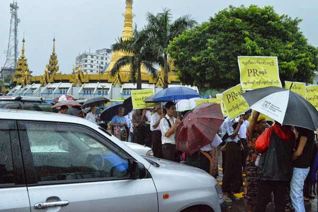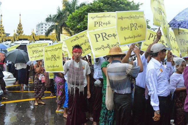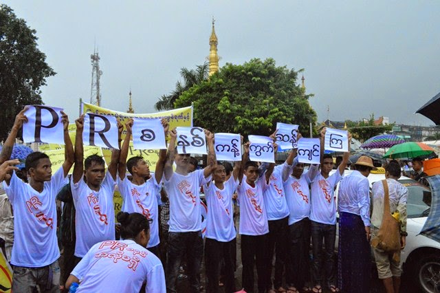 ေရွ႕ဆက္လုပ္မည္႕ ေရြးေကာက္ပြဲ မ်ားတြင္ အခ်ိဳးက်ကိုယ္စားျပဳ ပီအာရ္စနစ္ အသံုးၿပဳ မည္ကို ဆန္႕က်င္ကန္႕ကြက္ေသာအားျဖင္႕ ဆႏၵထုတ္ေဖာ္ပြဲကို ျပည္သူ႕လႈပ္ရွားမႈျမွင္႕တင္ေရး ကြန္ယက္မွဦးေဆာင္၍ ရန္ကုန္ၿမိဳ႕လည္ ၿမိဳ႕ေတာ္ခန္းမေရွ႕တြင္ ၂၀၁၄ ခုႏွစ္ ၾသဂုတ္လ (၅)ရက္ေန႕ ေန႕လည္(၁) နာရီက ျပဳလုပ္ခဲ႕သည္။