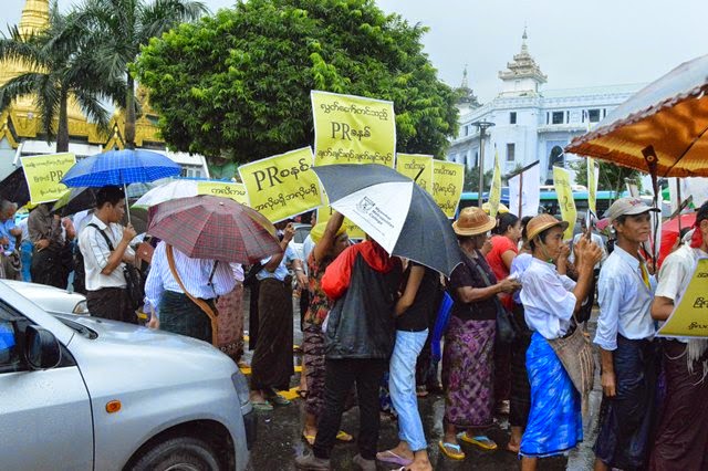 ဆႏၵျပသူမ်ားသည္ ပီအာရ္စနစ္အလိုမရိွ၊ကလီကမာ ပီအာရ္မလုပ္နဲ႕ ၊ အမ်ိဳးသားစည္းလံုးညီညြတ္ေရး ၿပိဳကြဲမည္႕ ပီအာရ္အႀကံ ဒို႕လက္မခံ၊ လႊတ္ေတာ္တင္သည္႕ ပီအာရ္စနစ္ ခ်က္ခ်င္းရပ္၊ တိုင္းရင္းသား ျပည္သူတရပ္လံုး သေဘာမတူသည္႕ ပီအာရ္ စနစ္ဆန္႕က်င္ၾက စေသာေၾကြးေၾကာ္သံမ်ားျဖင္႕ တိုင္တည္ေအာ္ဟစ္ ဆႏၵေဖာ္ထုတ္ခဲ႕ၾကသည္။