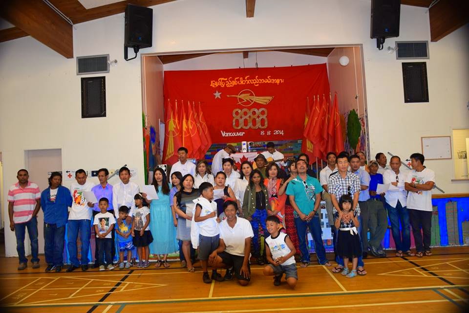 ကေနဒါႏိုင္ငံ၊ ဗန္ကူးဗား ဘီစီမွာ အေျခေနထိုင္ေနၾကတဲ့ ေက်ာင္းသားတပ္မေတာ္မွ ရဲေဘာ္၊ရဲေမေဟာင္းမ်ားက စုေပါင္းၿပီး ၂၆ ႏွစ္ေျမာက္ ရွစ္ေလးလုံး လူထုအေရးေတာ္ပုံအခမ္းအနားကို 33 Knight st , Vancouver BC က မိုးလုံေလလုံခန္းမေဆာင္မွာ ၾသဂုတ္၊၉၊ ၂၀၁၄ ေန ့မွာ မနက္ ၁၀ နာရီမွ ညေန ၂ နာရီထိ က်င္းပခဲ့ၾကပါတယ္။