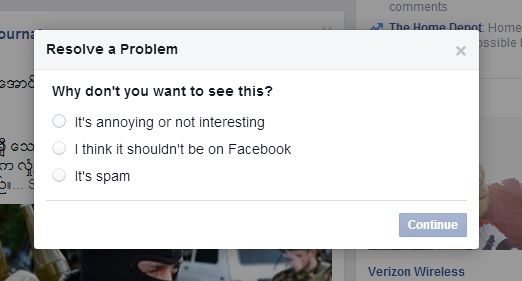 ေဖ့စ္ဘြတ္မွာ ကိုယ့္မၾကိဳက္တဲ့ မသင့္ေတာ္ဘူးထင္တဲ့ စာေတြကို ကန္႔ကြက္ျပီးေတာ့ ေဖ့စ္ဘြတ္ကေန ျဖဳတ္ခ်ခိုင္းလို႔ရပါတယ္။ Post ရဲ့ Pulldown ကေန Report this post ဆိုျပီး ဒီပို႔စ္ကို မျမင္ခ်င္ဘူး၊ သို႔မဟုတ္္ မတင္သင့္ဘူးဆိုျပီး ကန္႔ကြက္လို႔ရပါတယ္။ ဒါကေတာ့ ေဖ့စ္ဘြတ္မွာ တာ၀န္မဲ့ သူတပါးကို ေစာ္ကားသူေတြ၊ အမုန္းတရားပြားသူေတြ၊ အၾကမ္းဖက္မႈ ေစ့ေဆာ္သူေတြကို တားဆီးဖို႔ ေဖ့စ္ဘြတ္က တပ္ဆင္ထားတဲ့ ကိရိယာပါ။ အခုေတာ့ ဒါကို အာဏာရွင္ေတြက ေကာင္းေကာင္းၾကီးအသုံးခ်ျပီးေတာ့ သတင္းလြတ္လပ္ခြင့္အေရး၊ လူ႔အခြင့္အေရး လႈံေဆာ္သူေတြ တင္ဆက္သူေတြကို တန္ျပန္ဖိႏွိပ္ တုိက္ခိုက္ေနျပီလို႔ သတင္းမ်ားက ဆိုပါတယ္။