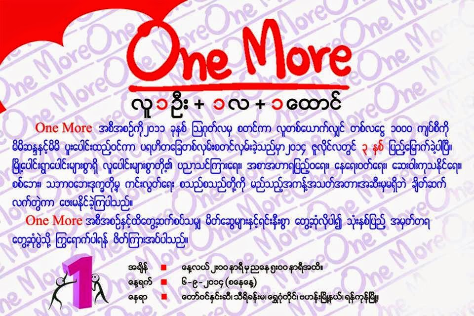 လူ ၁ ဦး၊ ၁ လ၊ ၁ ေထာင္ဟူျဖင့္ ၂၀၁၁ ခုႏွစ္၊ ၾသဂုတ္လကစခဲ့သည့္ One More အစီအစဥ္ သံုးႏွစ္ျပည့္ အမွတ္တရေတြ႕ဆံုပြဲကုိ စက္တင္ဘာလ ၆ ရက္ေန႔ ေန႔လည္ ၂ နာရီတြင္ ရန္ကုန္ၿမိဳ႕၊ ေရႊဂံုတုိင္ရွိ ေတာ္၀င္ႏွင္းဆီခန္းမတြင္ ျပဳလုပ္မည္ျဖစ္ေၾကာင္းသိရသည္။