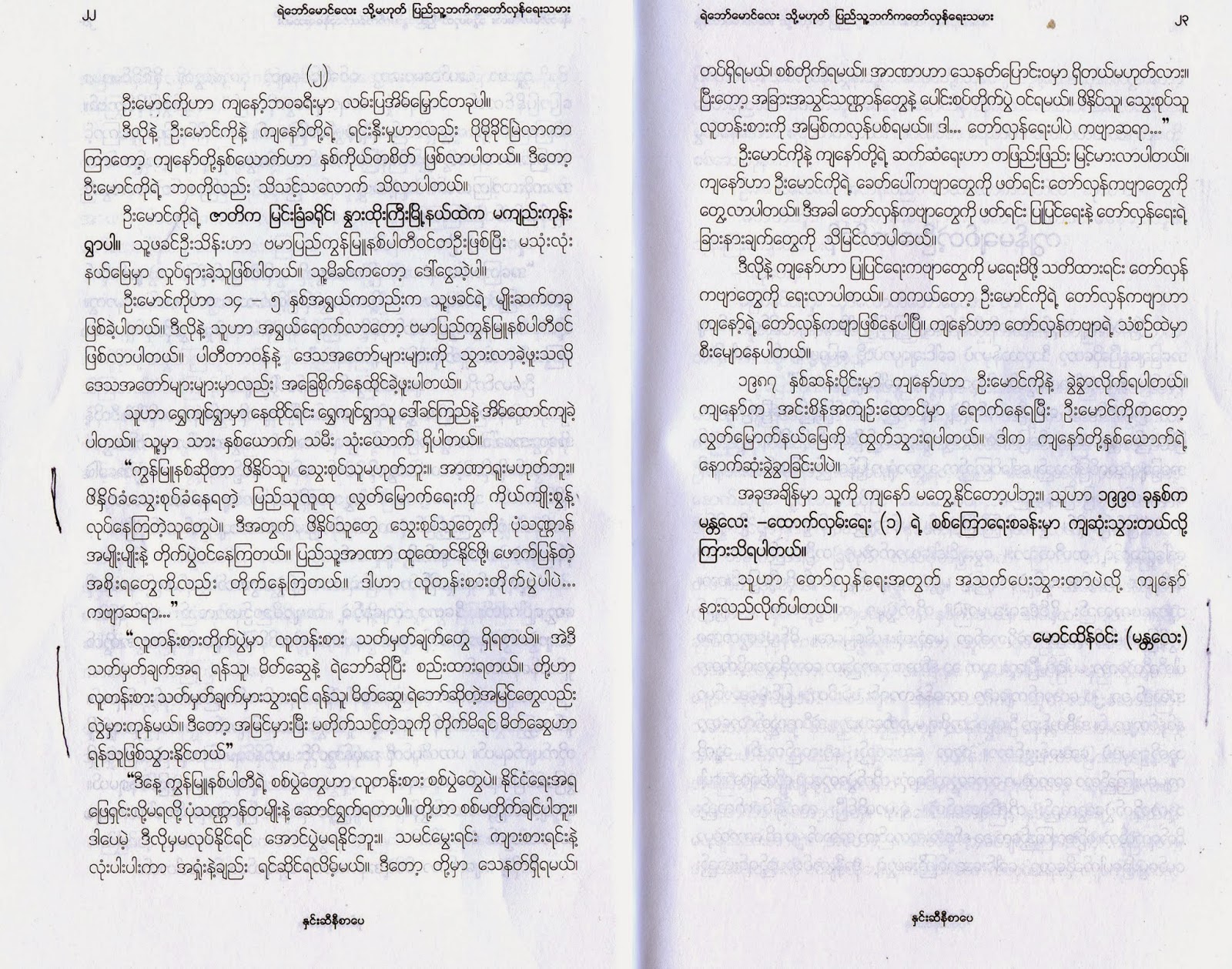 ျမန္မာျပည္ရဲ့ သမိုုင္းေနာက္ခံ ႏိုုင္ငံေရးမ်ဴိးဆက္ေတြမွာ လက္၀ဲကြန္ျမဴနစ္၊ လက္ယာဆိုုရွယ္နဲ႔ စစ္အုုပ္စုုတိုု႔ရဲ့ အာဏာႏိုုင္ငံေရးတိုုက္ပြဲေတြက ျပင္းထန္ခဲ့ပါတယ္။ ဒီအေၾကာင္းေတြကိုု ေႏွာင္းလူတိုု႔ ပကတိအတိုုင္း ျမင္သိေစဖိုု႔ ရႈေဒါင့္တခုုကိုု သည္စာအုုပ္ကေန ေတြ႔ရမွာ ျဖစ္ပါတယ္။