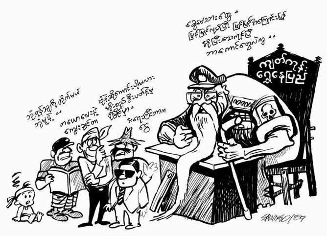 လူတိုုင္းေတြ႔ျမင္ေနၾက ဆိုုင္းဘုုတ္ေဟာင္းတခုုပါ။ စစ္အာဏာရွင္စနစ္ သက္ဇိုးေစရွည္ဘိုု႔ (တနည္းေျပာရရင္) စစ္ဗိုုလ္စစ္သားေတြကိုု ထာ၀ရကၽြန္ျပဳဘိုု႔ စစ္ဗိုုလ္ခ်ဴပ္ေတြရဲ ႔ ကိုုယ္ပိုုင္အဘိဓမၼာတခုုပါ။ ေျပာရရင္ေတာ့ဗ်ာ။ ေျခတေပါင္က်ဴိးအဘိဓမၼာတခုုေပါ့။ တပ္မေတာ္ဆိုုတာဘယ္သူေတြလဲ။ သူတိုု႔ေျပာတဲ့တပ္မေတာ္အႀကီးအကဲဆိုုသူလား။ ဒါမွမဟုုတ္ ဗိုုလ္ခ်ဴပ္ေတြကိုုေျပာတာလား။ ေရာခ်ထားတာေပါ့ဗ်ာ။ စစ္သားေတြ စစ္ဗိ္ုုလ္ေတြရဲ ႔စိတ္မွာကိုု ဗိုုလ္ခ်ဴပ္ေတြရဲ့ ထာ၀ရကၽြန္ျပဳမွဳကိုုခံရတာဟာ တရားတယ္ ဆိုုတဲ့အယူအဆကိုု မလိမ့္တပတ္နဲ ႔ စစ္တပ္ထဲ ဆြဲသြင္းလိုုက္တာပါ။ ဗိုုလ္ခ်ဴပ္ေတြ အမိန္႔ေပးရင္ ျပည္သူကိုု သတ္နိဳင္တယ္၊ ရိုုက္နိဳင္တယ္၊ ထိုုးႀကိတ္ နိဳင္တယ္။ စစ္တပ္ရဲ့အေဖ၊ အေမအရင္းဟာ ငါတိုု႔ဗိုုလ္ခ်ဴပ္ေတြျဖစ္တယ္။ လူထုုဟာ စစ္တပ္ရဲ ႔ရန္သူပဲ ဆိုုတဲ့ အယူအဆပါ။ စစ္တပ္ဟာ သီးသန္႔လူတန္းစားျဖစ္တယ္ဆိုုတဲ့ ဒီအယူအဆကိုု တစိမ့္စိမ့္နဲ ႔ေအာက္ေျခ၊ အရာရွိအရာခံ အၾကပ္တပ္သားေတြရဲ ႔ ဦးေႏွာက္ထဲ သြတ္သြင္းခဲ့ၾကတာျဖစ္ပါတယ္။ စစ္တပ္ကိုု ဦးေႏွာက္ေဆးေၾကာလိုုက္တာပါ။