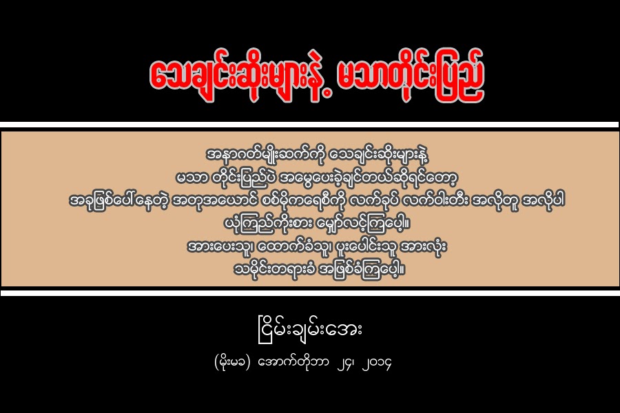 ဒါေပမယ့္ ဒီလို ေသခ်င္းဆိုး ေသပြဲ ဝင္ရတဲ့ ျဖစ္စဥ္ ေတြ တိုင္းျပည္မွာ ရပ္ သြား မွာ မဟုတ္ဘူး။ စစ္တပ္ ဂုေဏာ အနေႏၱာ ျဖစ္ေနသေရြ႕၊ စစ္ဖြဲ႕စည္းပံု သာ ကိုးကြယ္ရာ ရတနာ ျဖစ္ေနသေရြ႕ လူအမ်ား တေန႔ မဟုတ္ တေန႔၊ တနည္း မဟုတ္ တနည္း နဲ႔ ေသခ်င္းဆိုး ျဖစ္ရပ္ေတြ ၾကံဳေနရဦးမယ္။