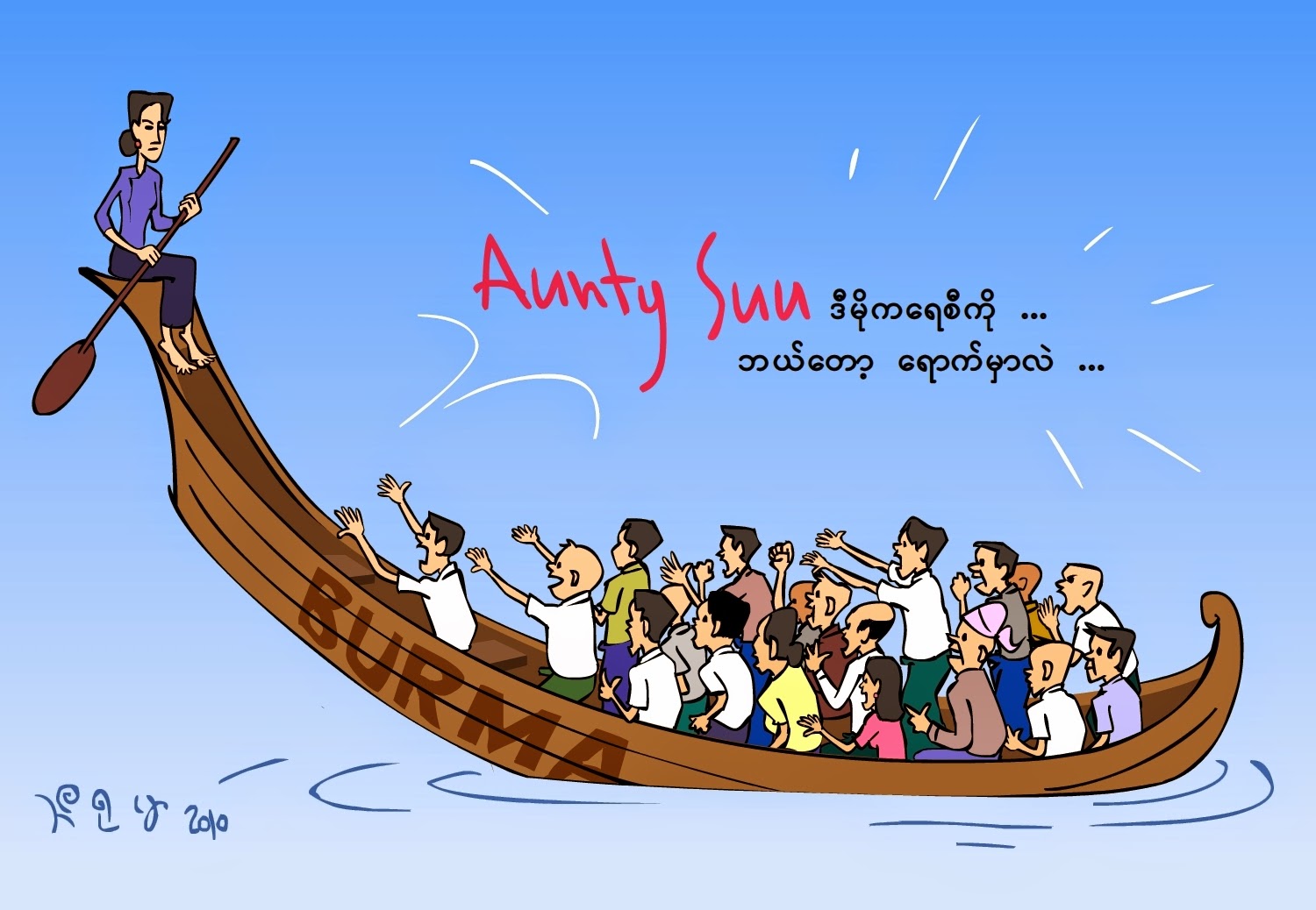 အထက္က ကၽြန္ေတာ္ အတင္းအုပ္ခဲ႔သည္႔ ကၽြန္ေတာ္႔မိတ္ေဆြ ကို ခြင္႔လႊတ္ပါ။ ရိုးသားပါသည္။ ေဒၚစုကို သူမၾကိဳက္ခြင္႔ရိွပါသည္။ သူ႔ထင္ျမင္ယူဆခ်က္ကို ေျပာပိုင္ခြင္႔ အျပည္႔ရိွပါသည္။ သို႔ေသာ္…ေမစု၊ ေမၾကီးစု၊ ေကာင္းကင္ေမေမ လုပ္ေနသည္႔ ရဲရဲေတာက္ ဒီမိုကေရစီ ဘက္ေတာ္သားမ်ားအေနျဖင္႔ လမ္းေလးခြ တက္ၿပီး လက္သီး လက္ေမာင္တန္းမွ၊ Facebook ေပၚမွာ မိမိတို႔ ဒီမိုအခ်င္းခ်င္း အျပန္အလွန္ like ၾက၊ ရွယ္ၾက လုပ္ၾကမွ ဒီမိုကေရစီ အေရး လုပ္ေနသည္လို႔ ထင္ျမင္မွာစိုးရိမ္သည္။  အြန္လိုင္းေပၚမွာ အံ႔ခ်ီးဖြယ္ Status ေတြ တင္မွ ဒီမိုကေရစီ အေရး လုပ္ေနသည္လို႔ ထင္ျမင္မွာ စိုးရိမ္သည္။ ကၽြန္ေတာ္ ေျပာၿပီးပါၿပီေရာ… ေဒၚစုကို အားမကိုးပါနဲ႔လို႔။ ကိုယ္႔ကိုယ္ ကိုယ္သာ အားကိုးၾကစမ္းပါဗ်ာလို႔ ကၽြန္ေတာ္ေျပာရင္ ကၽြန္ေတာ္႔သူငယ္ခ်င္းကိုေရာ၊ ခင္ဗ်ားတို႔ကိုေရာ ေျပာတယ္လုိ႔ မွတ္ပါ။ ကၽြန္ေတာ္႔ကိုယ္ ကၽြန္ေတာ္လည္း သတိေပးရင္းေပါ႔။