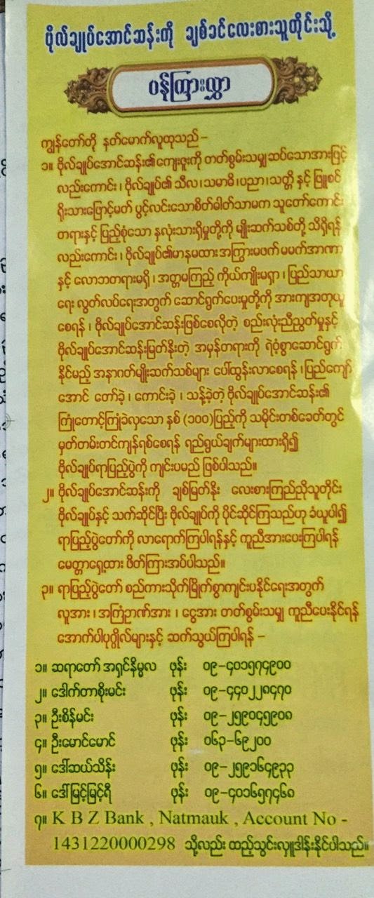 ရန္ကုန္ျမိဳ့သို႔ တိုက္ရုိက္ဆက္သြယ္ လွဴဒါန္းလိုပါက ရန္ကုန္ျမိဳ့ ပုဇြန္ေတာင္ျမိဳ့နယ္၊ ဗိုလ္ခ်ဳပ္ေအာင္ဆန္းလမ္းႏွင့္ ဗိုလ္တေထာင္ဘုရားလမ္းေဒါင့္၊ “ကံဦးေက်ာင္း၊ မဟာေညာင္ကုန္းတုိက္” သို႔ သြားေရာက္ ဆက္သြယ္ လွဴဒါန္းႏိုင္ၾကပါသည္။ အလွဴေငြမ်ားကို နတ္ေမာက္ျမိဳ့တြင္ က်င္းပမည့္ ဗိုလ္ခ်ဳပ္ေအာင္ဆန္း ႏွစ္ ၁၀၀ ျပည့္ ပြဲေတာ္သို႔ ေပးအပ္လွဴဒါန္းမည္ ျဖစ္သည္။