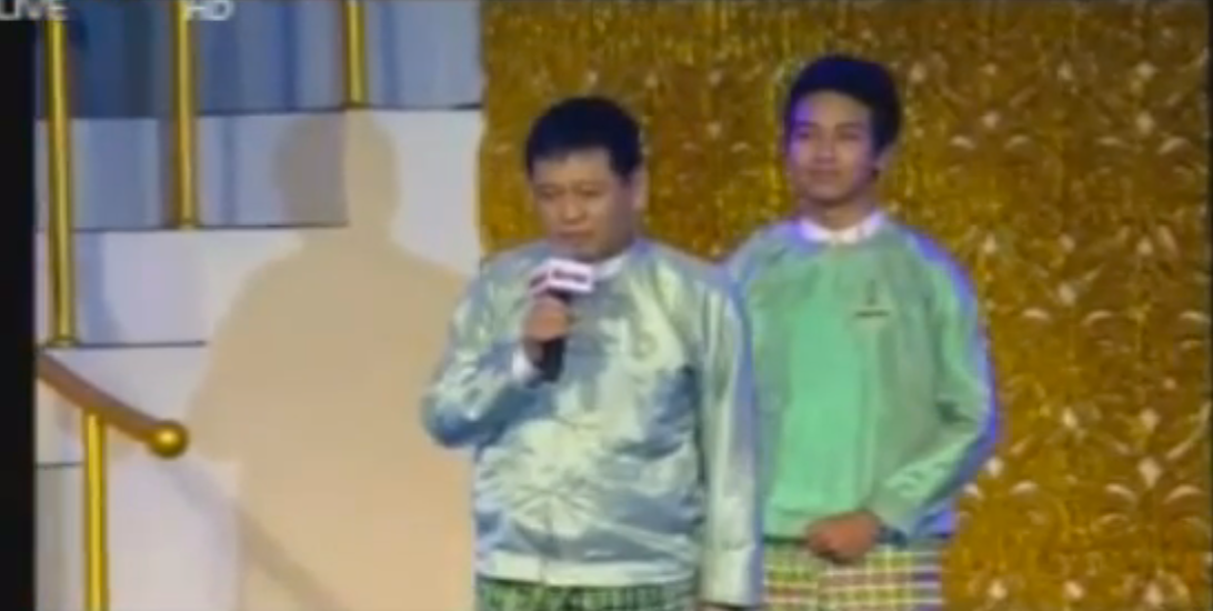 သို႔ေသာ္ ကၽြန္ေတာ့္သမီးႀကီးအသက္က ၄၈ ႏွစ္ပါ၊ ေနာက္ႏွစ္ႏွစ္ဆို ၅၀ ျပည့္ပါၿပီ။ ကၽြန္ေတာ္က ၇၀ ပါ။ ေႏြေပါက္တာနဲ႔ ၇၀ ကို နင္းပါၿပီ။ ကၽြန္ေတာ့္ကို ဦးေအာင္ျမင့္ျမတ္က ေျပာတယ္၊ တြဲမယ့္ကေလး ေခၚလာပါတဲ့။ ဘာမွမလိုပါဘူးခင္ဗ်၊ ေအးေဆးပါ၊ ပါးပါးေလး… (ေျခေထာက္တစ္ဖက္တည္းျဖင့္ စင္ေပၚတြင္ စကၠန္႔ပိုင္း ရပ္ျပ)။ ကၽြန္ေတာ့္အမူအရာေတြ မက်စ္လစ္ဘူးဆိုရင္ ခြင့္လႊတ္ပါ။