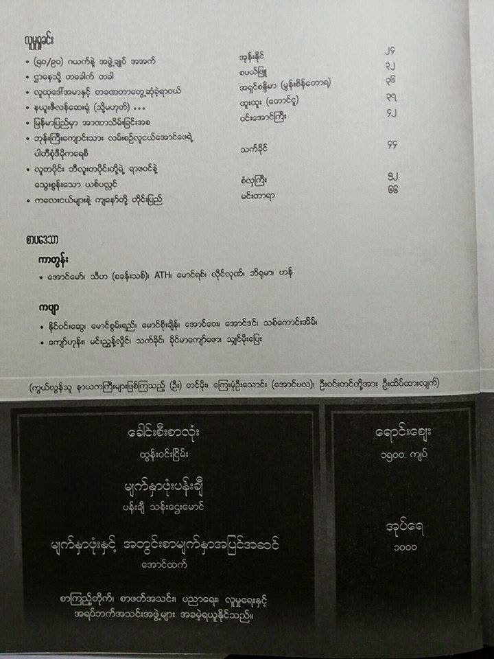 ပန္းခ်ီသန္းေဌးေမာင္ရဲ့ stop the war ပန္းခ်ီကားကိုု မ်က္ႏွာဖုုံးအျဖစ္ သုုံးစြဲတင္ဆက္ထားပါတယ္။ ေဖာ္ျပခြင့္ျပဳေသာ ဆရာသန္းေဌးေမာင္ကိုု ေက်းဇူးတင္ပါေၾကာင္း၊ မိုုးမခ၏ ျပည္တြင္း ျပည္ပ ကေလာင္ရွင္မ်ားအားလုုံးကိုု ေက်းဇူးတင္ပါေၾကာင္း၊ မိုုးမခခ်စ္သူမ်ားအားလုုံး ႏွစ္သစ္မွာ ရႊင္လန္း ခ်မ္းေျမ့ၾကပါေစ၊ ရန္သူမ်ဴိး ၅ ပါးစလုုံး ေအာင္ျမင္ နင္းေခ် ႏိုုင္ၾကေစေၾကာင္း ဆုုမြန္ေတာင္းလိုုက္ပါတယ္။