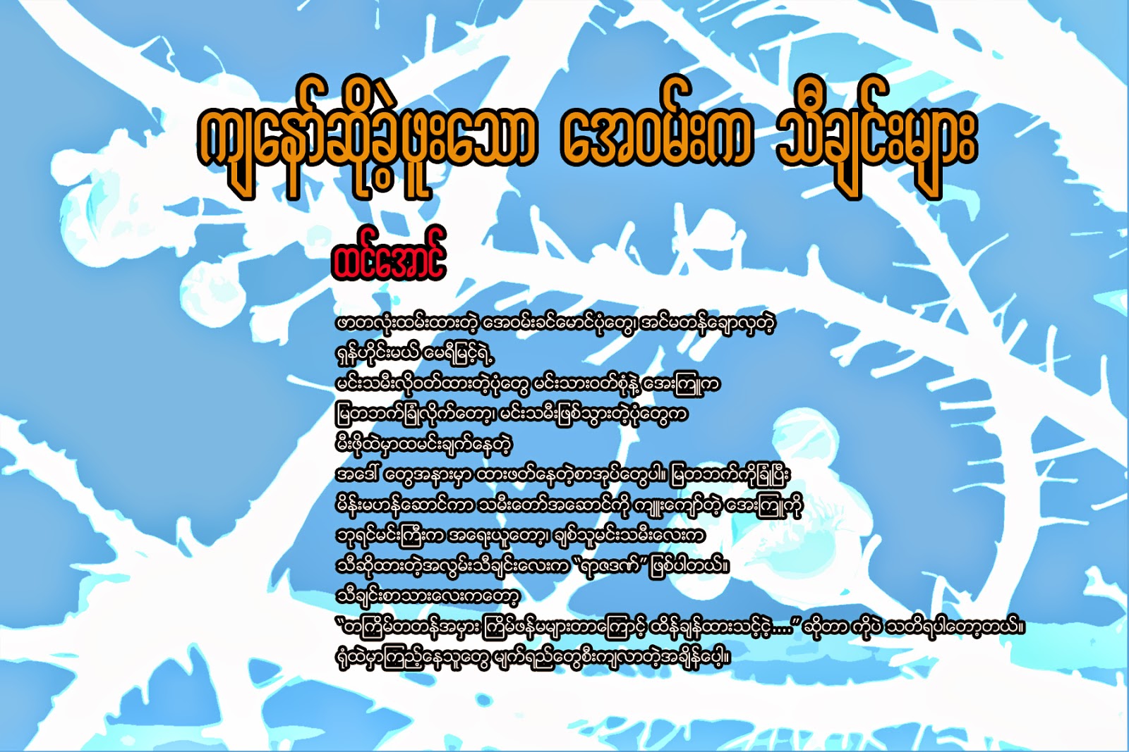 ငယ္ငယ္ကထဲက ေအဝမ္းက “ေမာင္ေခြးဘို႔” ဆိုၿပီးကဗ်ာေလးေတြကို သံစဥ္ထည့္ သီဆိုထားတဲ့သီခ်င္းေလးေတြကို စဆို ရာကေန တျဖည္းျဖည္းနဲ႔ လွမဥၥဴ၊ နတ္ရွင္ေနာင္၊ ခ်စ္ေရစင္၊ ခ်စ္ပဲြဝင္၊ ခ်စ္ဒုကၡ စတဲ့ေတးကို ႏွစ္သက္သီက်ဴးတတ္လာပါတယ္။ ခုေတာ့ ေအာင္ျခင္းရွစ္ပါး၊ ရွင္သီဝလိ ေက်ာင္းေတာ္ရာသီခ်င္းေတြကို နားေထာင္ရင္း တရားသေဘာေတြကို ေတြးေတာရတဲ့ အရြယ္ျဖစ္လာပါၿပီ။ ဒါေတာင္ တခါ တခါ စန္းစန္းတင့္ဆိုခဲ့တဲ့ ဗုတ္တလုပ္ကန္၊ တင္တင္ေအးဆိုထားတဲ့ ပ်ဳိ႕ဆုေတာင္း ေတးေတြကို ေရခ်ိဳးရင္း ညည္းမိပါေသးတယ္။ ျမန္မာအေဆြကစၿပီး ေအဝမ္းအလယ္၊ ျမေဇာ္၊ ေမာင္ေမာင္စိုးတို႔အဆံုး ထုတ္လုပ္သမွ်ေတးေတြကို ႀကိဳက္ႏွစ္သက္ေနတဲ့ ကြၽန္ေတာ္အတြက္ အသက္အရြယ္အရ ရိပ္သာကိုဝင္ တရားမွတ္ခ်ိန္ ေရာက္ရင္ ဒီေတးေတြကို အာ႐ံုေရာက္ ၾကားေယာင္ေနလုိ႔ တရားမွတ္လုိ႔မွ ရႏိုင္ပါ့မလားလုိ႔ ပူပန္ေနမိပါေတာ့တယ္။