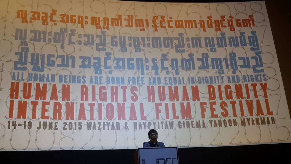ဇြန္ ၁၄၊ ၂၀၁၅ (ရန္ကုန္ၿမိဳ႕၊ ဆူးေလဘုရားလမ္း၊ ေနျပည္ေတာ္ရုပ္ရွင္ရံုတြင္ ဇြန္လ ၁၄ ရက္ေန႔က ျပဳလုပ္ေသာ လူ႔အခြင့္အေရး၊ လူ႔ဂုဏ္သိကၡာ ရုပ္ရွင္ပဲြေတာ္ ဖြင့္ပဲြ အခမ္းအနားတြင္ ၈၈ မ်ဳိးဆက္ ပြင့္လင္းလူ႔အဖဲြ႔အစည္း ေခါင္းေဆာင္ မင္းကိုႏုိင္ ေျပာၾကားသည့္ မိန္႔ခြန္း)