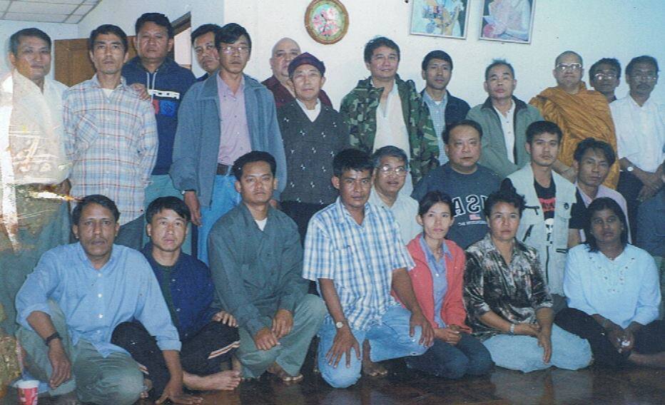 | ဓာတ္ပုံ – ရဲေဘာ္ထက္မိုး (ေရွ႕ဆုံးတန္း အက်ီၤ အျပာကြက္၀တ္ဆင္ထား) ကို ၂၀၀၁ ခုႏွစ္က ထိုင္းျမန္မာနယ္စပ္ တေနရာတြင္ျပဳလုပ္ေသာ အခမ္းအနားတခု၌ ႏိုင္ငံေရးနယ္ပယ္အသီးသီးမွ လုပ္ေဖာ္ကိုင္ဖက္မ်ားႏွင့္အတူ ေတြ႔ရစဥ္။ |