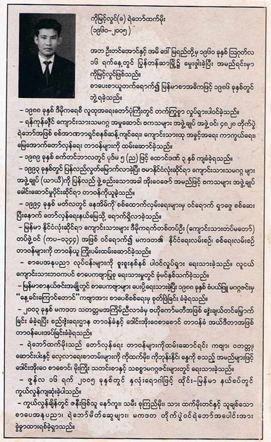 က်ေနာ္ ့ဘ၀မွာ သမရိုးက်ခင္မင္တြယ္တာရာ မိတ္ေဆြသူငယ္ခ်င္း ညီရင္းအကို ေမာင္ ရင္းႏွမလို ေနခဲ့ၾကသူေတြလည္းမ်ားလွ သလို က်ေနာ္ ့စိတ္ႏွလုံးသားက ပိုမိုေလးနက္ ခိုင္က်ည္တဲ့စိတ္နဲ႔ အေလးအျမတ္ျပဳမိသူေတြကေတာ့ စာေပအႏုပညာ ခ်စ္ျမတ္ႏိုးမႈ နဲ႔ ေလာကအျမင္ ဘ၀အျမင္၊ ၿပီး ေတာ့ ေခတ္ကေတာင္းဆုိေနတဲ့ လိုအပ္ခ်က္ေတြအေပၚ ကိုယ္ယုံၾကည္ ခ်က္ရွိတဲ့အတိုင္း၊ ကိုယ္ လုပ္ႏိုင္စြမ္းရွိသမွ်တာ၀န္ယူကာ ဘ၀ကိုပုံေပး စြန္႔လႊတ္အနစ္နာခံတတ္သူမ်ဳိးေတြ ေပးဆပ္သြား သူေတြခ်ည္းျဖစ္ပါတယ္။ အထူးသျဖင့္ ေခတ္ဆိုးစနစ္ဆိုးႀကီးကို ကိုယ္ႏိုင္ရာစြမ္းရာနဲ႔ တြန္းလွန္ ဆန္႔က်င္ရင္း က်ဆုံးသြားသူေတြကိုေပါ့။
