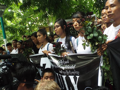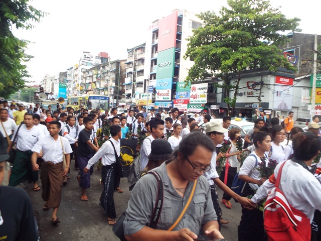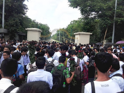 အေလးျပဳခဲ့ၾကသည္။ တကၠသုိလ္ ေက်ာင္းသားမ်ားက ကမၻာမေက်ဘူး သီခ်င္းကုိ မုိးေရထဲတြင္ သံၿပိဳင္သီဆုိၿပီး အဆုံးသတ္ခဲ့သည္။