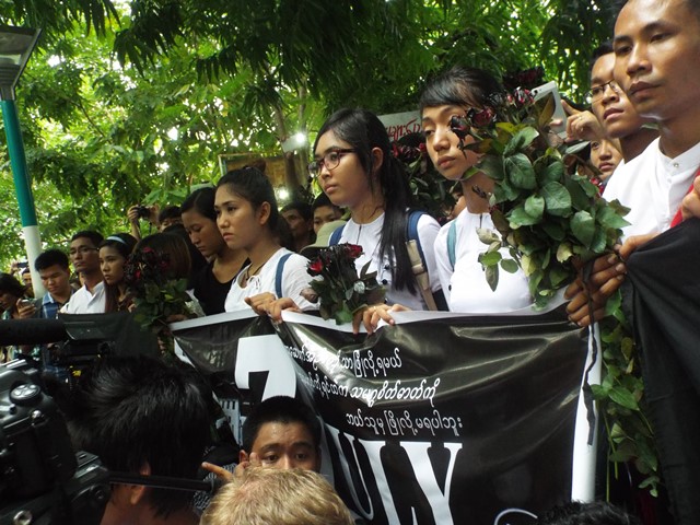 တကၠသုိလ္ေက်ာင္းသားလူငယ္မ်ားသည္ ဇူလုိင္လ ၇ရက္ ေန႔ခင္း ၂နာရီတြင္ ကမာရြတ္ၿမိဳ႕နယ္ စံရိပ္ၿငိမ္မွတ္တုိင္မွ တကၠသုိလ္ေက်ာင္းဝင္း အတြင္းရွိ ေက်ာင္းသားသမဂၢ အေဆာက္အဦးေဟာင္းေရွ႕သုိ႔ ခ်ီတက္လမ္းေလွ်ာက္လာၿပီး ၅၃နွစ္ျပည့္ ဆဲဗင္းဇူလုိင္ ေအာက္ေမ့ဖြယ္အခမ္းအနားကုိျပဳလုပ္ခဲ့ၾကသည္။ ၄င္းအခမ္းအနားတြင္ ေက်ာင္းသားမ်ားက ေသြးေျမက်ခဲ့ေသာ ေက်ာင္းသား၊ ျပည္သူ၊ ရဟန္းရွင္လူမ်ားကုိ ခြပ္ေဒါင္းအလံအေရွ႕တြင္ ဝမ္းနည္းျခင္းအထိမ္းအမွတ္အျဖစ္