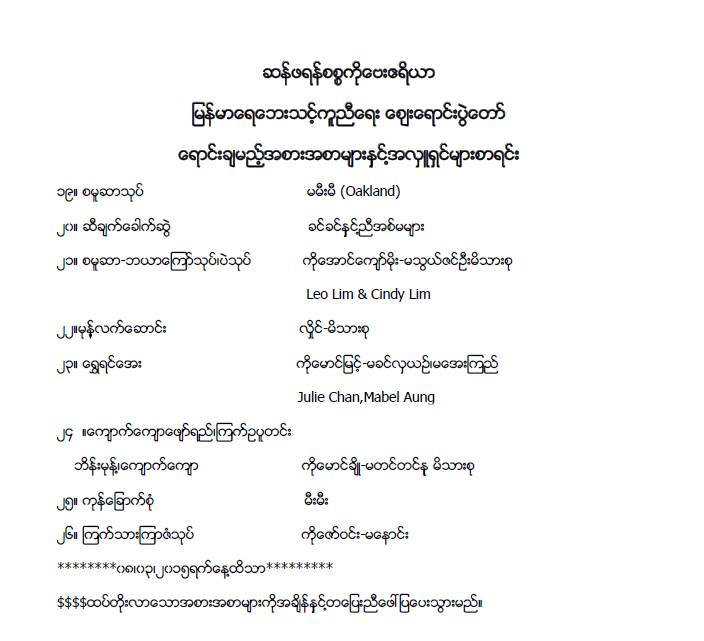 ျမန္မာေရေဘးသင့္ ျပည္သူမ်ား ကူညီေရး ဆန္ဖရန္ေဘးဧရိယာျမန္မာမိသားစုမ်ား၏ အသက္ဆက္ေရာင္ျခည္ ေစ်းေရာင္းပြဲ (ၾသဂုတ္ ၉၊ ဆန္းေဒး)