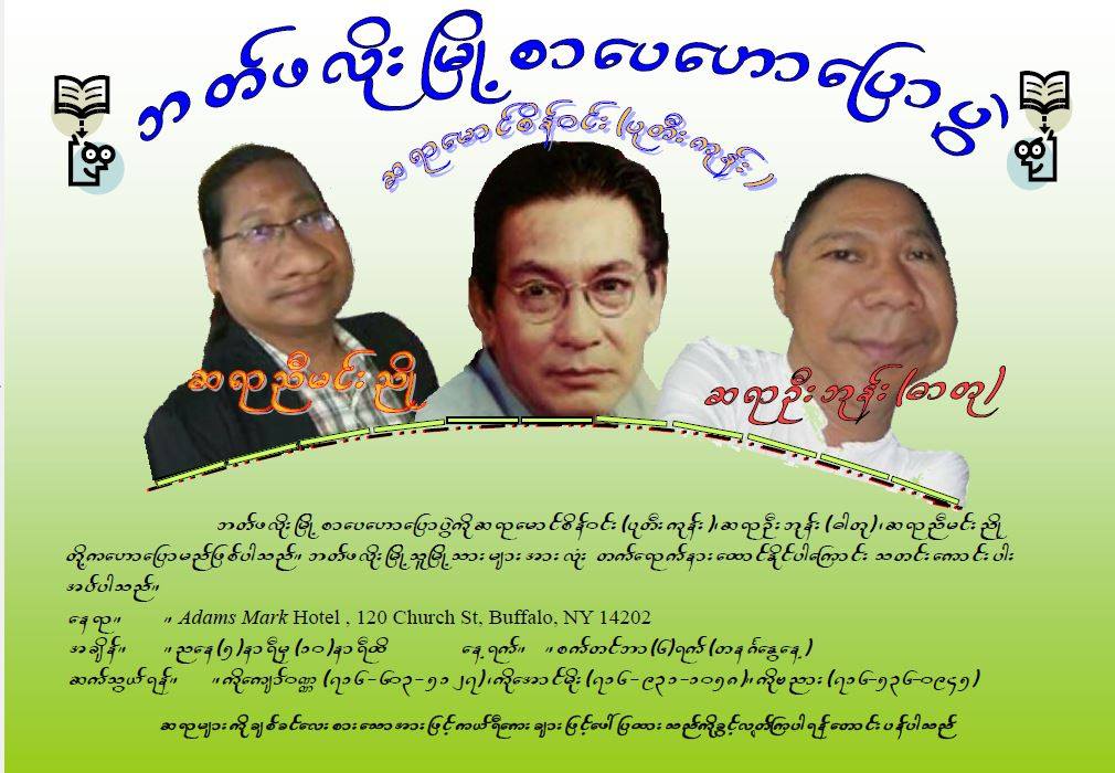 အေမရိကန္ျပည္အေရွ႔ျခမ္း ၊ နယူးေယာက္ျပည္၊ ဘတ္ဖဲလိုုးျမိဳ့တြင္ စက္တင္ဘာ ၆၊ ညေနခင္း စာေပေဟာေျပာပြဲကိုု ၎စာေ/းဆရာမ်ားႏွင့္ စီစဥ္ထားသည္ဟုု သိရသည္။