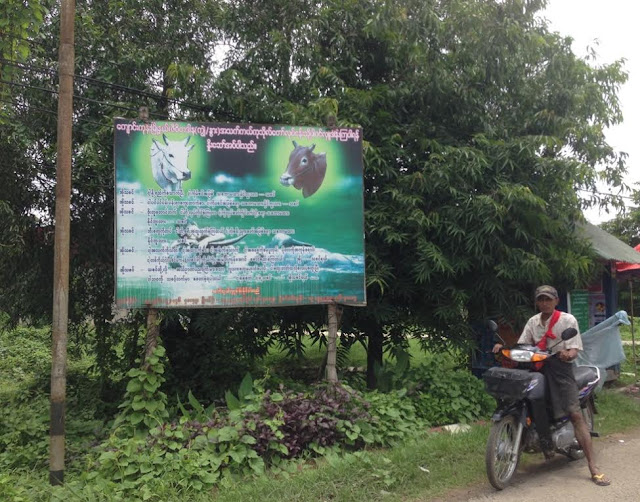 ဧရာဝတီတိုင္းေဒသႀကီး ေက်ာင္းကုန္းၿမိဳ႕နယ္တစ္ေနရာတြင္ စိုက္ထူထားေသာ ကြ်ဲ/ႏြားအသက္ကယ္ရန္ ပါဝင္လွဴဒါန္းၾက ေရး ႏိႈးေဆာ္ခ်က္ ပိုစတာ (ဓာတ္ပံု – Myanmar Now) |