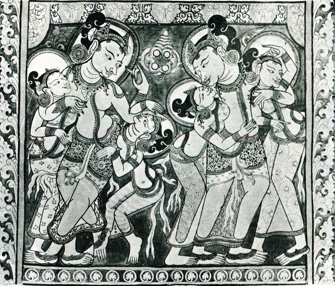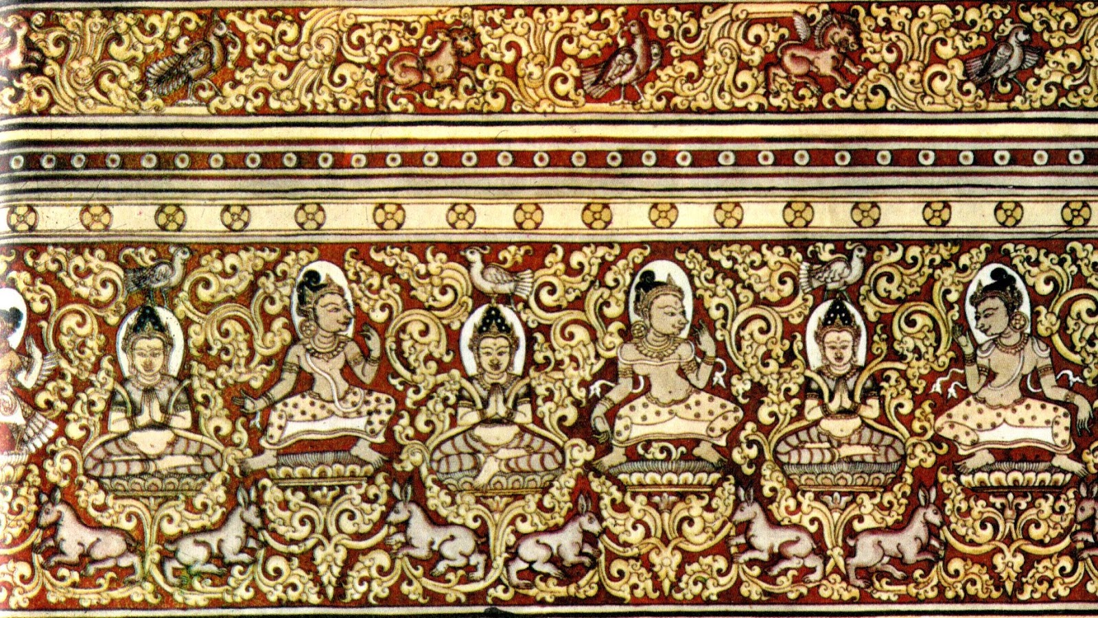 ဆိုခဲ့တဲ့ နတ္သား၊ နတ္သမီး ပန္းခ်ီပံုေတြက အိႏိၵယအေရွ႕ပိုင္းေဒသ ေဆးေရးပန္းခ်ီေတြမွာ ေတြ႕ရေလ့ရွိတဲ့ ပန္းခ်ီေရးဆြဲထံုး အေနနဲ႕ သာမန္ တန္ဆာဆင္မႈ ပန္းခ်ီေရးဆြဲဟန္ အေလ့အက်က္အရ အလွအပ ေရးဆြဲထားတယ္လို႕ ယူဆစရာရွိပါတယ္။ ပန္းႏြယ္၊ ပန္းခက္၊ ပန္း၀ိုင္းေတြ အၾကားမွာလည္း ရုပ္ပံုအမ်ိဳးမ်ိဳး၊ မတ္ရပ္နတ္ရုပ္၊ သားရဲရုပ္၊ ကိႏၷရာရုပ္၊ ဘီလူးရုပ္၊ နဂါးရုပ္၊ ဆင္ရုပ္ စတဲ့ တျခားအရုပ္ေတြကိုလည္း ေရာေႏွာ ေရးဆြဲထားပါတယ္။