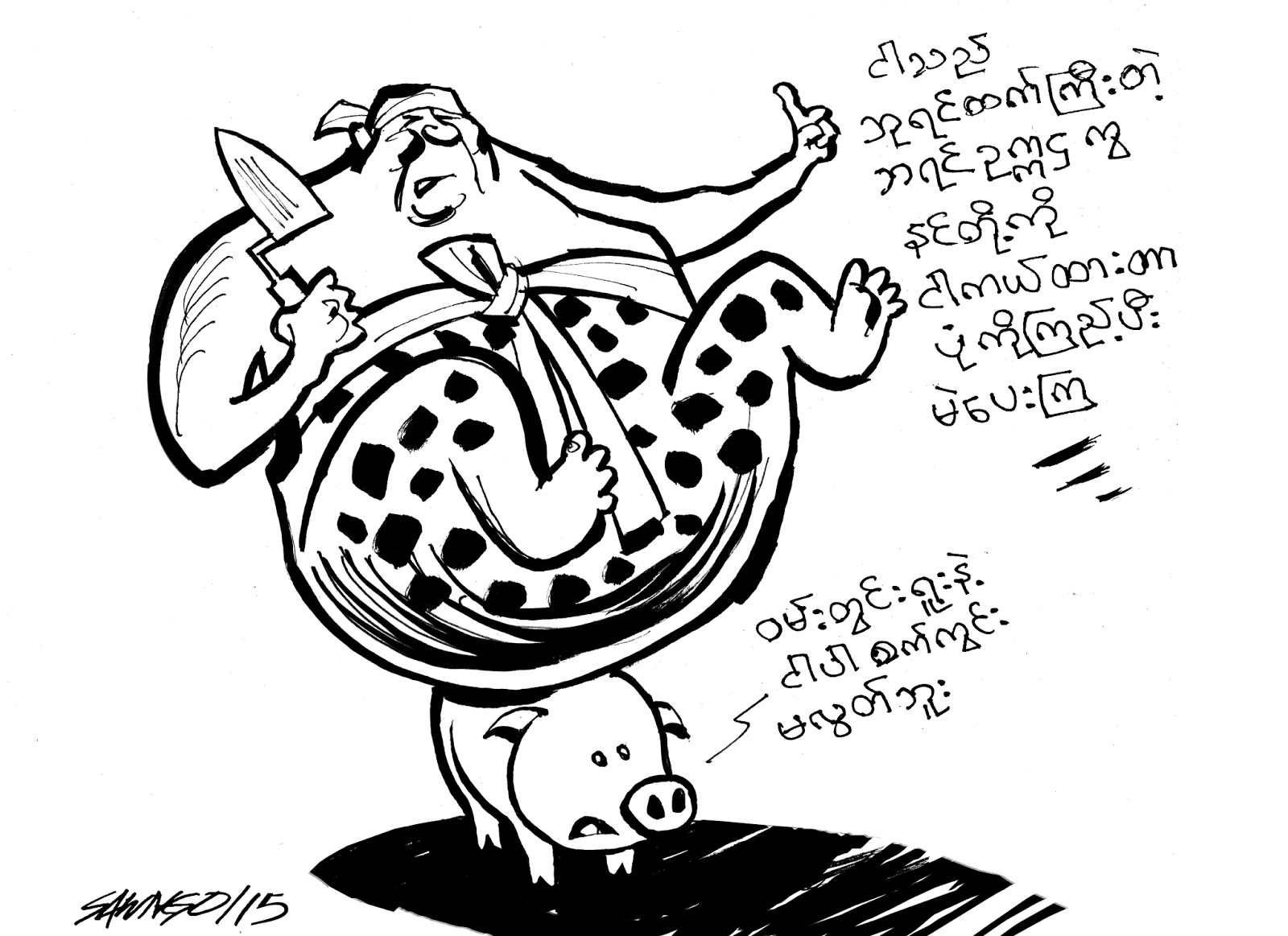 တိုင္းျပည္ၿငိမ္းခ်မ္းေရးကို ၾကည့္လိုက္အံုး … တိုင္းျပည္လြတ္လပ္ခ်ိန္ကတည္းက ဗမာစကား ေကာင္းေကာင္းမေျပာ၊ အဘတို႔ ႀကိဳးစားတည္ေဆာက္ေနခဲ့တဲ့ ဗမာလူမ်ဳိးႀကီးဝါဒေအာက္မွာ ဝပ္စင္းဝပ္တြား မခိုလံႈခ်င္ၾက၊ ဆူပူထၾကြ ပုန္ကန္ျခားနားေနၾကတဲ့ တိုင္းရင္းသားအုပ္စုေတြကို စာမတတ္ေပမတတ္၊ အသက္မျပည့္ လူမမယ္စစ္သား အသက္ေပါင္းမ်ားစြာ စေတးၿပီး ေခ်မႈန္းသုတ္သင္၊ ေတာေတာင္တိုင္းတပါးေတြကို ေမာင္းထုတ္ခဲ့တာ အဘတို႔ ျဖစ္တယ္။ ဒီလို တိုင္းျပည္ရန္စြယ္ေတြကို ပက္ပက္စက္စက္ ေခ်မႈန္းေနတာ တိုင္းျပည္အေရး အဘတုိ႔ ေတြးပူလို႔။ ဒီလုပ္ရပ္အတြက္ လူ႔အခြင့္အေရး ေစာင့္ၾကည့္ေရးတုိ႔၊ ကုလသမဂၢ လူ႔အခြင့္အေရးအဖြဲ႔ေတြရဲ ႔ အသိအမွတ္ျပဳျခင္းခံရ၊ အေရးတယူ ေျပာဆိုခံရတာေပါ့။ အဘတို႔သာ မရွိရင္ ဒီလုိကမာၻ႔ႀကီးရဲ ႔ အေလးထားမႈကို ဘယ္ရေတာ့မလဲ။