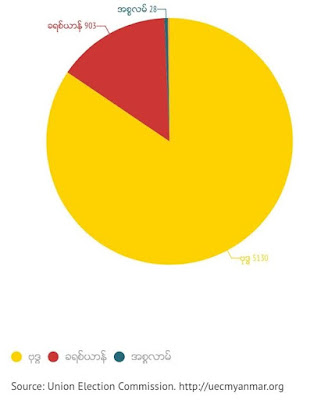 ျပည္ေထာင္စုေရြးေကာက္ပြဲေကာ္မရွင္ရဲ႕ ကိန္းဂဏန္းေတြအရ ေရြးေကာက္ပြဲမွာ ဝင္ၿပိဳင္မယ့္ လႊတ္ေတာ္ကိုယ္စားလွယ္ ေလာင္း ၆,ဝဝဝ ေက်ာ္အနက္ အမ်ားစုဟာ ဗုဒၶဘာသာဝင္ေတြျဖစ္ၿပီး အစၥလမ္ဘာသာဝင္ ၂၈ ဦးသာပါဝင္တဲ့အတြက္ ရာခိုင္ႏႈန္းအရ တြက္ရင္ ဝ ဒသမ ၅ ရာခုိင္ႏႈန္းပဲရွိတာ ေတြ႔ရပါတယ္။