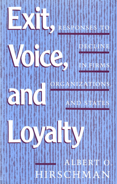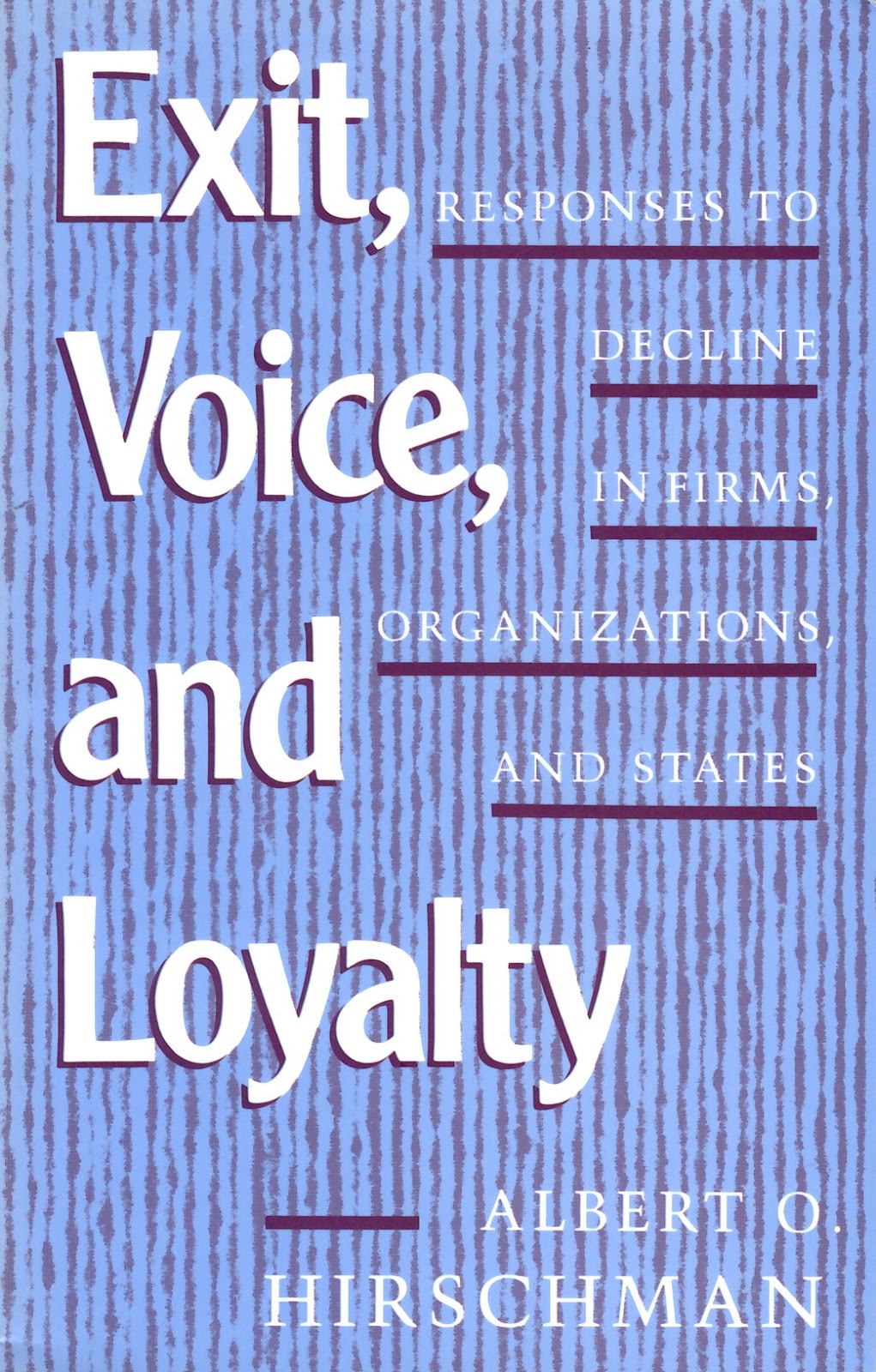 ၁၉၇၀ ခုႏွစ္က အေမရိကန္ႏုိင္ငံ ပရင္စတန္တကၠသိုလ္မွ Albert Hirschman ဆိုသူက Exit, Voice and Loyalty ဆိုေသာ စာအုပ္တအုပ္ေရးသားထုတ္ေ၀ခဲ့ပါသည္၊ “ထြက္ေပါက္၊ ဆႏၵျပျခင္းႏွင့္ သစၥာေစာင့္သိျခင္း” ပာူ၍ ျမန္မာျပန္ေသာ္ ရႏိုင္လိမ့္မည္ ထင္ပါသည္၊ ဤစာအုပ္တြင္ လူတို႔၏ လူ႔က်င့္၀တ္ ႏွင့္ ႏုိင္ငံေရး၊ စီးပြားေရး တို႔ ဆက္စပ္ပံုမ်ားကို ေဖာ္ျပထားပါသည္။