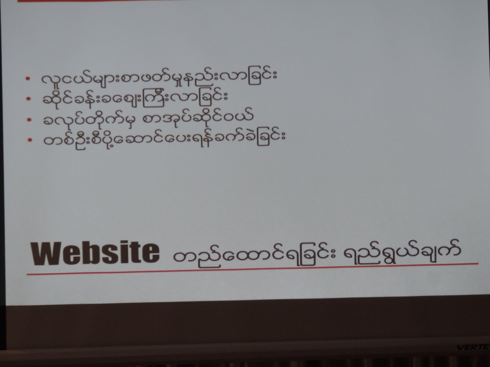 ဒီကေန႔ Royal Garden Restaurant မွာ Website ဖြင့္ပြဲနဲ႔ သူတို႔ လုပ္ငန္းေဆာင္တာ ေတြကို ရွင္းလင္းမိတ္ဆက္တဲ့ ပြဲေလးက်င္းပခဲ့ပါတယ္။ ရန္ကုန္ၿမိဳ႕တြင္းနဲ႔ နယ္ၿမိဳ႕မ်ားကို တစ္အုပ္ခ်င္းမွာယူမယ္ဆုိရင္ေတာင္ စာအုပ္ေစ်းရင္းအတိုင္း အိမ္အေရာက္ပို႔ေပးမယ့္ စနစ္ကေလးျဖစ္ပါတယ္။ ၂ေသာင္းခြဲဖိုးနဲ႔ အထက္မွာယူမယ္ဆိုရင္ ၁၀% ေလွ်ာ့ေပးမယ္လို႔သိရပါတယ္။