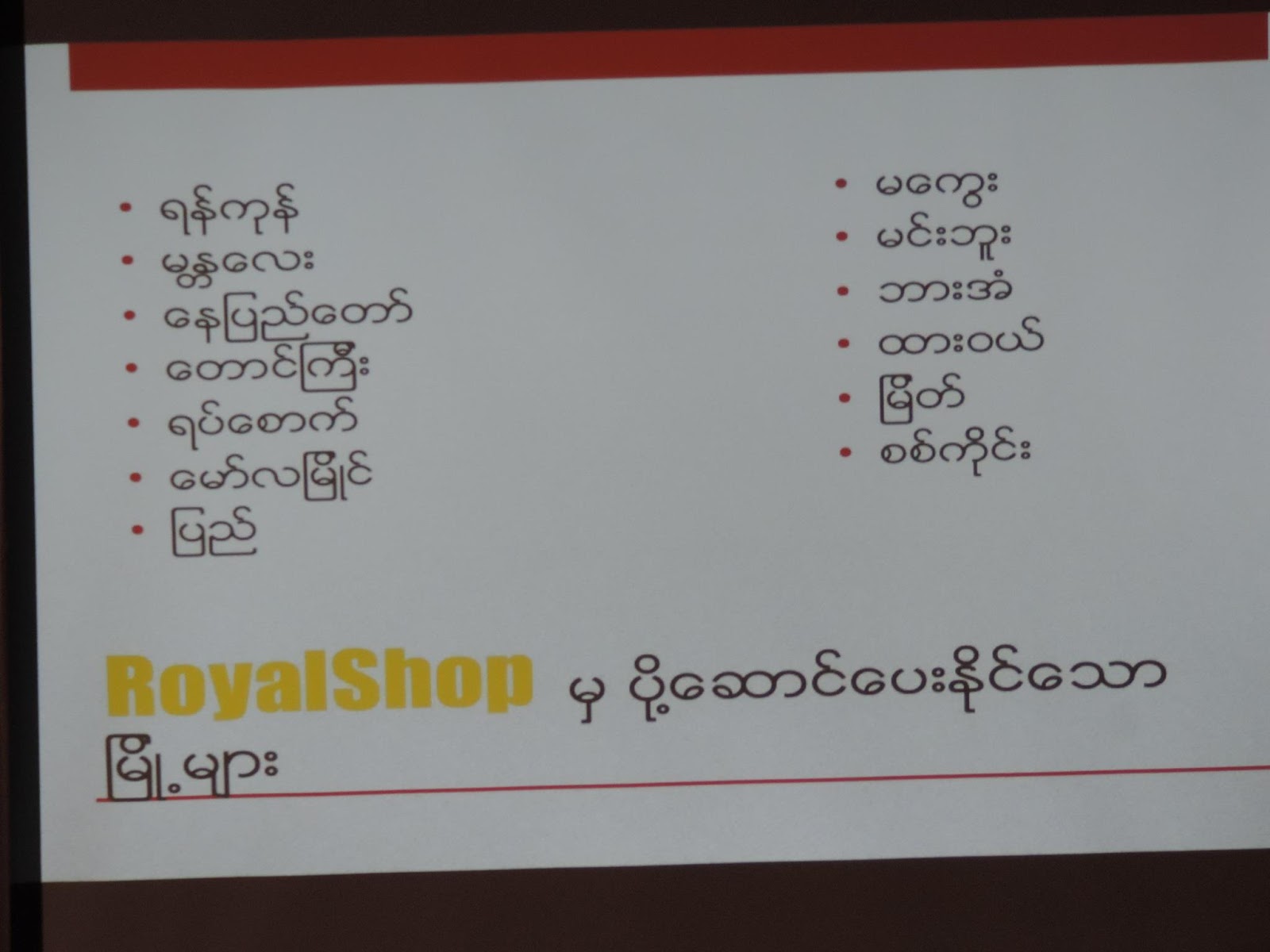Royalshop.biz ဆိုသည့္ အြန္လိုင္းစာအုပ္အေရာင္း WebSite ရဲ႕ သတင္းေလးကို ေဝမွ်ေပးလိုက္ပါတယ္။ Facebook မွာလည္း ဒီနာမည္အတိုင္းျဖစ္ပါတယ္။
