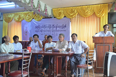 ဆရာႀကီးသခင္ကုိယ္ေတာ္မႈိင္းၿငိမ္းခ်မ္ေရးကြန္ရက္ရဲ႔ ဗမာျပည္၏ လက္ရွိႏိုင္ငံေရးအခင္းအက်င္း နဲ႔ ျပည္တြင္း ၿငိမ္းခ်မ္းေရး အလားအလာသေဘာထားထုတ္ျပန္ေၾကညာခ်က္ကုိ ဦးျမင့္စန္းကဖတ္ၾကားခဲ့ပါတယ္။ အခမ္းအနားမွဴးအျဖစ္ ကုိထြန္း၀င္းၿငိမ္းကေဆာင္ရြက္ခဲ့ၿပီး ေဒသအသီးသီးက မႈိင္းၿငိမ္းကြန္ရက္ကုိယ္စားလွယ္မ်ားျဖစ္ၾကတဲ့ ဦးေအာင္ျမင့္ဦး၊ ဦးေတာေက်ာ္၊ ဦးခ်စ္ေဆာင္ဦး၊ ဦးျမင့္ေအး၊ ဦးတင္ေအးၾကဴတုိ႔က လက္ရွိႏိုင္ငံေရးအခင္းအက်င္းနဲ႔ ျပည္တြင္းၿငိမ္းခ်မ္းေရးအလားအလာမ်ားကုိတင္ျပခဲ့ၾကပါတယ္။ သေဘာထားထုတ္ျပန္ေၾကညာခ်က္ အျပည့္အစုံကုိေဖာ္ျပလုိက္ပါတယ္။