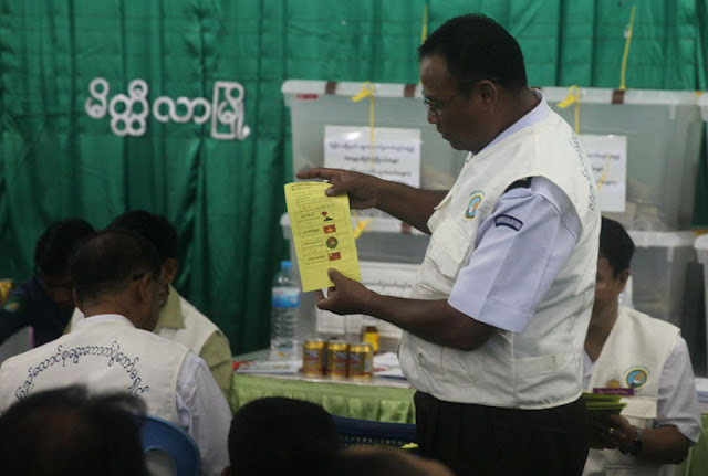 မဲရံုအရာရွိက အဝါေရာင္မဲလက္မွတ္မ်ားကို တစ္ခုၿပီးတစ္ခု ေကာက္ယူကာ “ေဒါက္တာ ေမာင္သင္း၊ ေဒါက္တာ ေမာင္သင္း” ဟူေသာ ျပည္ေထာင္စု ႀကံ့ခုိင္ေရးႏွင့္ ဖံြ႔ၿဖိဳးေရးပါတီ ကိုယ္စားလွယ္ေလာင္းတစ္ဦး၏ အမည္ကို စကၠန္႔မလပ္ ေၾကညာသံက ခပ္က်ဥ္းက်ဥ္း အခန္းငယ္ထဲတြင္ အခ်က္က်က်ေပၚထြက္ေနသည္။