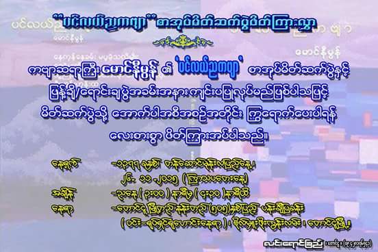 ကဗ်ာဆရာႀကီးေမာင္နီမြန္၏“ပင္လယ္ညကဗ်ာ“စာအုပ္မိတ္ဆက္ပြဲႏွင့္ ျဖန္႔ခ်ီ/ေရာင္းခ်ပြဲအခမ္းအနားက်င္းပျပဳလုပ္မည္ျဖစ္ပါသျဖင့္ မိတ္ဆက္ပြဲသို႔ေအာက္ပါအစီအစဥ္အတိုင္းၾကြေရာက္ေပးပါရန္ ေလးစားစြာ ဖိတ္ၾကားအပ္ပါသည္ ။