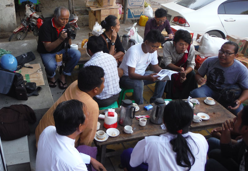 | ျပခန္းျပဳလုပ္ရာ ဓမၼသာလာ ခန္းမ အနီး လက္ဘက္ရည္ဆုိင္တြင္ ေတြ႔ရေသာ အနယ္နယ္မွ စာေပသမားမ်ား |