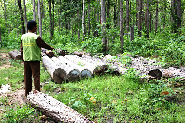 | ခ်ပ္သင္းေဘးမဲ့ေတာထဲ သစ္ခိုးထုတ္သူေတြဆီက ဖမ္းဆီးရမိခဲ့တာေတြကို သစ္ေတာဝန္ထမ္းတစ္ဦးက လိုက္လံျပသေနပံု |