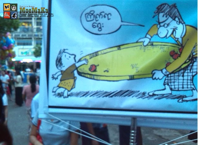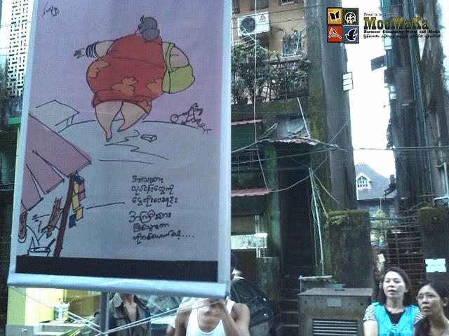ရန္ကုန္တုိင္းေဒသႀကီး ပုဇြန္ေတာင္ျမိဳ႕နယ္ ေရေက်ာ္အရပ္တြင္ သီတင္းကြ်တ္ပဲြေတာ္ႀကီး က်င္းပလ်က္ရိွရာ ထုိေဒသရိွ လမ္း ၅၀ အထက္လမ္းတြင္ ကာတြန္းျပပဲြတစ္ခုကုိလည္း ယခု ညေနပုိင္းက စတင္ ျပသထားသည္ကုိ ေတြ႔ရိွရသည္။