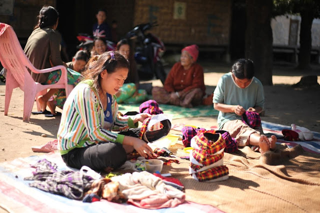 ဝင္ေငြရရန္ ကခ်င္ရိုးရာေခါင္းေပါင္း ခ်ဳပ္လုပ္ေနၾကတဲ့ အမ်ဳိးသမီးမ်ား။ မိနစ္ေလးငါးဆယ္ၾကာခ်ဳပ္ရတ့ဲ |