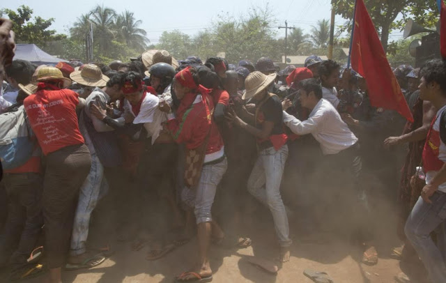 ဓာတ္ပံုအညႊန္း – ဒီမိုကေရစီပညာေရးေက်ာင္းသားသပိတ္ အၾကမ္းဖက္မၿဖိဳးခြင္းမီ သပိတ္ေမွာက္ေက်ာင္းသားမ်ားက လံုးျခံဳေရးဝန္ထမ္းရဲမ်ား၏ အတားအဆီးမ်ားကို ေက်ာ္လႊားရန္ ႀကိဳးပမ္းေနၾကစဥ္၊