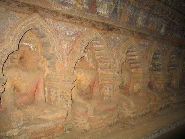 အေနာက္ဘက္မွာရွိတဲ့ အ၀င္မုခ္ေပါက္ကေန ၀င္ေရာက္တဲ့အခါ၊ အေမွာင္ရိပ္က်ေနတဲ့ အတြင္းလိုဏ္ပတ္လမ္းႏွစ္ခုအနက္၊ ေအာက္ဘက္က အျပင္လမ္း နရံေတြမွာ ဗုဒၶဆင္းတုေတာ္မ်ားကို ထားရွိပါတယ္။