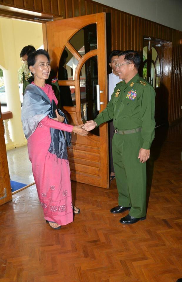 ေဒၚေအာင္ဆန္းစုၾကည္ႏွင့္ ကာခ်ဳပ္ မင္းေအာင္လိႈင္တို႔ ေဖေဖာ္၀ါရီ ၁၇၊ ေနျပည္ေတာ္တြင္ ေတြ႔ဆုံစဥ္