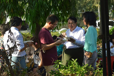 ၾကာဆံေၾကာ္ျဖင့္ ေကၽြးေမြးဒါနျပဳခဲ့ၿပီး မိတ္ကပ္ပညာရွင္ မႀကီးစန္း(ခင္စန္း ဝင္း) ကလည္း အသုပ္စံုကိုေရာင္းခ်၍ ရံပံုေငြကို