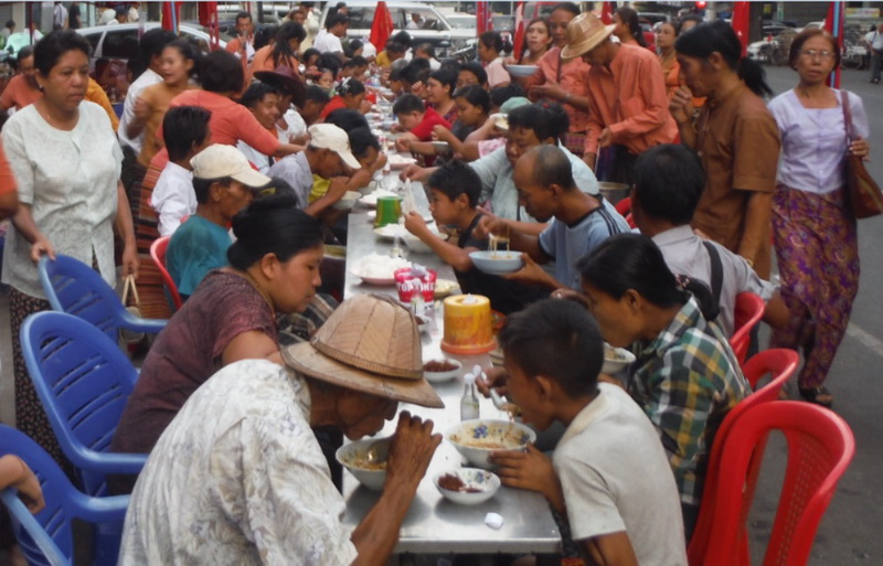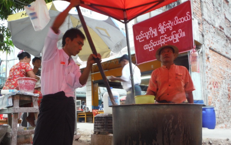 (မိုးမခဓာတ္ပံုသတင္း) ဧၿပီ ၁၊ ၂ဝ၁၆ၾကာသပေတးေန႔ညေနပုိင္းက ရန္ကုန္ၿမိဳ႕၊ ပုဇြန္ေတာင္ျမိဳ႕နယ္ အမ်ဳိးသား ဒီမိုကေရစီ အဖဲြ႔ခ်ဳပ္ အဖဲြ႔ဝင္တုိ႔က သမၼတ ဦးထင္ေက်ာ္ ႏွင့္ အစိုးရအဖဲြ႔အား ႀကိဳဆို ဂုဏ္ျပဳသည့္ အေနျဖင့္ မုန္႔ဟင္းခါး စတုဒီသာ ေကြ်းေမြးၿပီး အလွဴလုပ္ၾကသည္။ (ဓာတ္ပံုမ်ား – မုိးမခ)