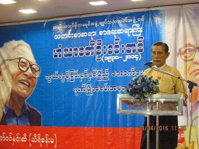 ဆက္လက္ၿပီး “သတင္းစာေလာက၊ မီဒီယာေလာကက ဖိတ္လုိ႔ ဆုံတုိင္းမွာ ေရွးဦးပထမ က်ေနာ္ဟာ ဆရာႀကီးဟံသာဝတီဦးဝင္းတင္ရဲ႕ ေက်းဇူးတရားေတြကုိ အတုိခ်ံဳးၿပီးေတာ့အနည္းငယ္ေျပာၿပီးမွ သူ႔ကုိဂုဏ္ ျပဳၿပီးမွ က်ေနာ္ဆက္လက္ေျပာစရာရွိတာမ်ား ေျပာပါတယ္၊ ဘာေၾကာင့္လဲဆုိေတာ့ က်ေနာ္တုိ႔ေခါင္းေဆာင္ ျဖစ္တဲ့ ဟံသာဝတီဦးဝင္းတင္ဟာ အသက္ရွင္သန္လ်က္ရွိေနေသးတယ္” ဟုေျပာသည္။