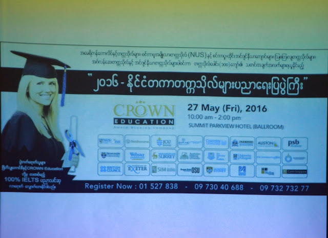 ျမန္မာႏိုင္ငံမွ ေက်ာင္းသူ၊ ေက်ာင္းသားမ်ားႏွင့္ ႏိုင္ငံတကာပညာေရးကို စိတ္ဝင္စားသည့္ မိဘမ်ား၊ ေက်ာင္းသား၊ ေက်ာင္းသူမ်ားအတြက္ အေမရိကန္၊ ၾသစေၾတးလ်၊ အဂၤလန္၊ စကၤာပူ၊ ထိုင္းႏိုင္ငံတို႔မွ တကၠသိုလ္ေပါင္း(၁ဝဝ)ေက်ာ္၏ သတင္းအခ်က္အလက္မ်ားရယူႏိူင္မည့္ “ႏိုင္ငံတကာပညာေရးျပပြဲ ၂ဝ၁၆”ကို ရန္ကုန္ျမိဳ႕၊ အလံုလမ္း ရွိ SUMMIT PARKVIEW HOTEL (Ball Room) တြင္ ေမလ (၂၇) ရက္၊ နံနက္ (၁ဝ)နာရီမွ မြန္းလြဲ (၂)နာရီ အထိ က်င္းပျပဳလုပ္သြားမည္ဟုသတင္းရရွိသည္။