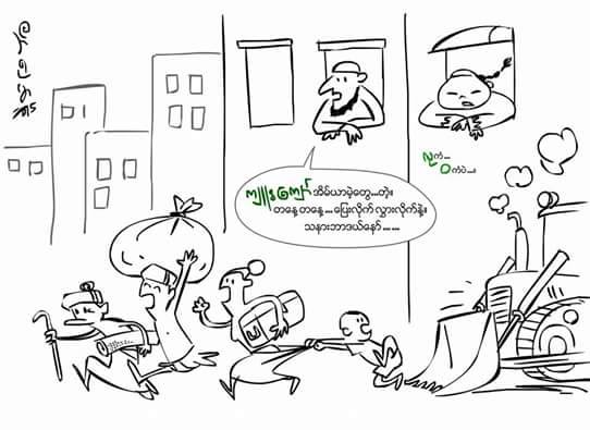 ေဒၚအာက်ယ္။ ။ ေရေျမာင္းေတြပိတ္တာ..က်ဳပ္တို႔က ေဖာ္ရမယ္..ဟုတ္စ။ ေမာင္မင္းႀကီးသား စည္ပင္ေတြကိုေပးထားရတဲ႔ေစ်းခြန္၊ အိမ္ခြန္၊ ျခံခြန္ ၊မိလႅာခြန္၊ ဒါေတြတင္မက.. လမ္းေဘး ကြမ္ယာဆိုင္ ပိစိေကြးကအစ..တရား၀င္လားမ၀င္လားမသိတဲ့ စည္ပင္ခြန္ေတြ ေကာက္ထား တာေလ.။ သူတို႔က အခြန္ေတာ့ယူၿပီး ေျမာင္းေလးမွေဖာ္မေပး..အမႈိက္ကေလးမွလာသိမ္း မေပးဘူးတဲ့လား..၊ ေျပာင္းလည္းခ်ိန္ တန္ၿပီေလ..၊ က်ဳပ္တို႔မဲေပးခဲ့တဲ့ အစိုးရသစ္ႀကီးရဲ ႔ ရက္(၁၀၀)စီမံကိန္းေတြထဲမွာ ဒါေတြမပါဘူးတဲ့လား..။